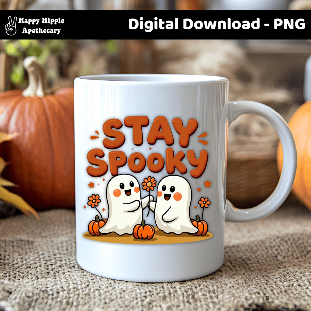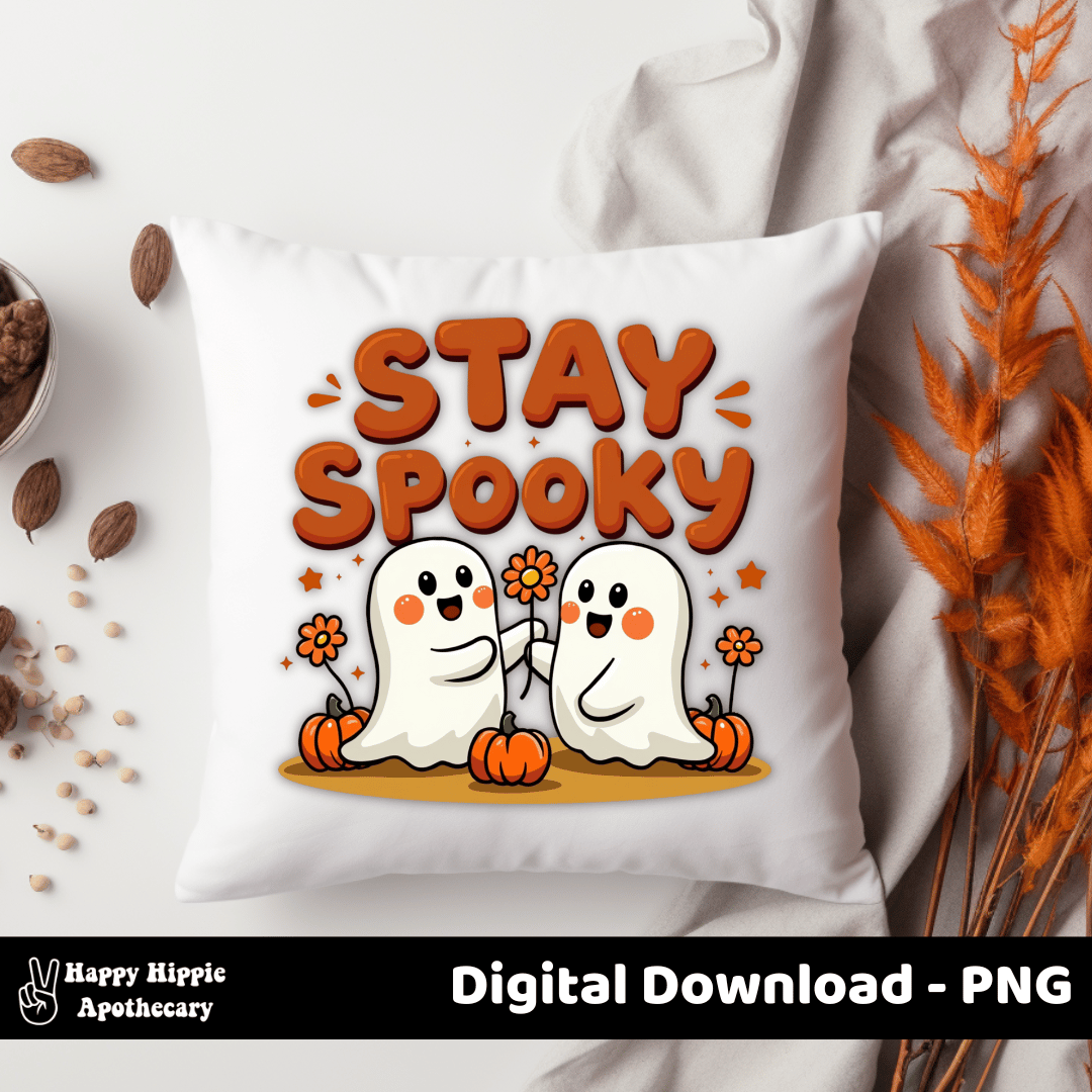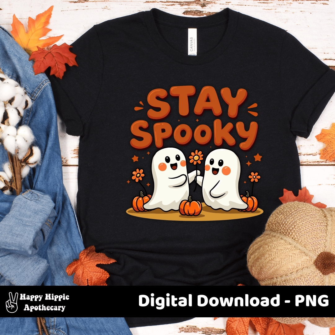 Keep the spooky season fun and cozy with this Stay Spooky Ghosts PNG. Adorable retro-style ghosts with pumpkins and flowers — perfect for sublimation, stickers, mugs, shirts, tote bags, and more.