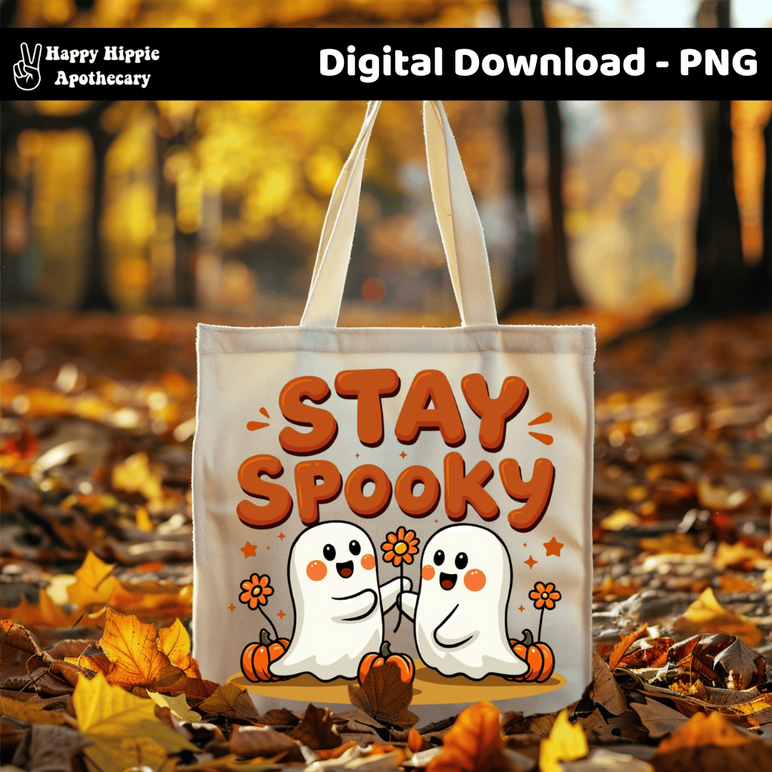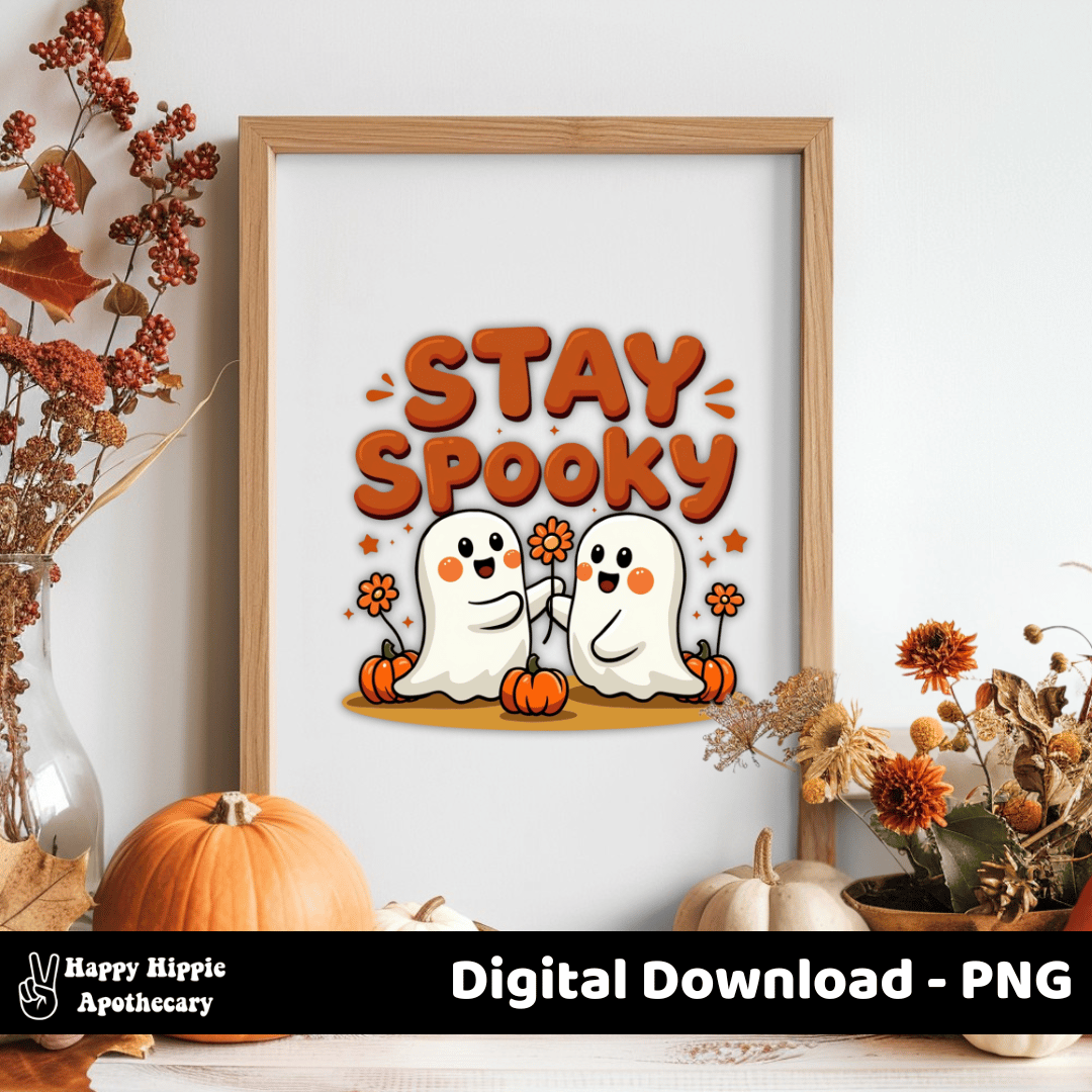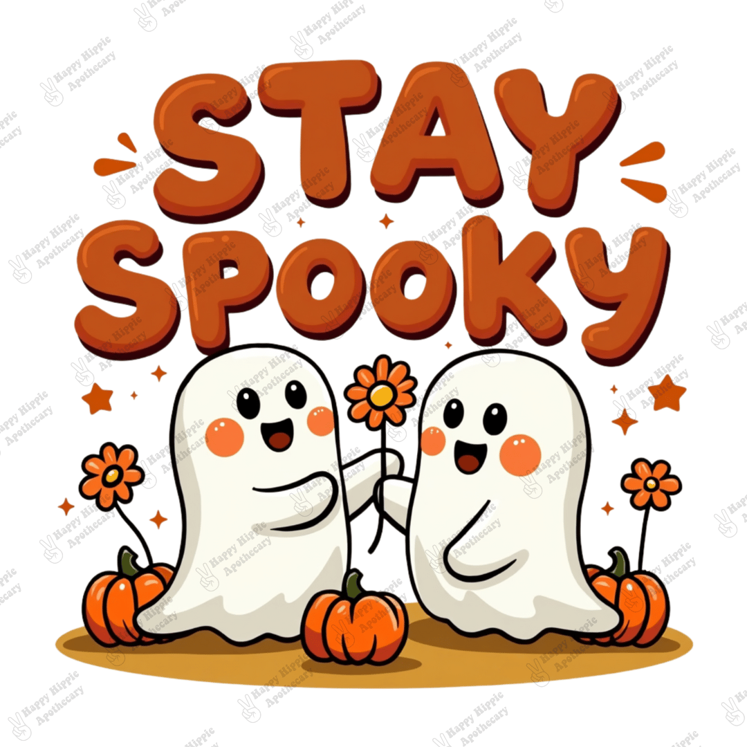 Keep the spooky season fun and cozy with this Stay Spooky Ghosts PNG. Adorable retro-style ghosts with pumpkins and flowers — perfect for sublimation, stickers, mugs, shirts, tote bags, and more.