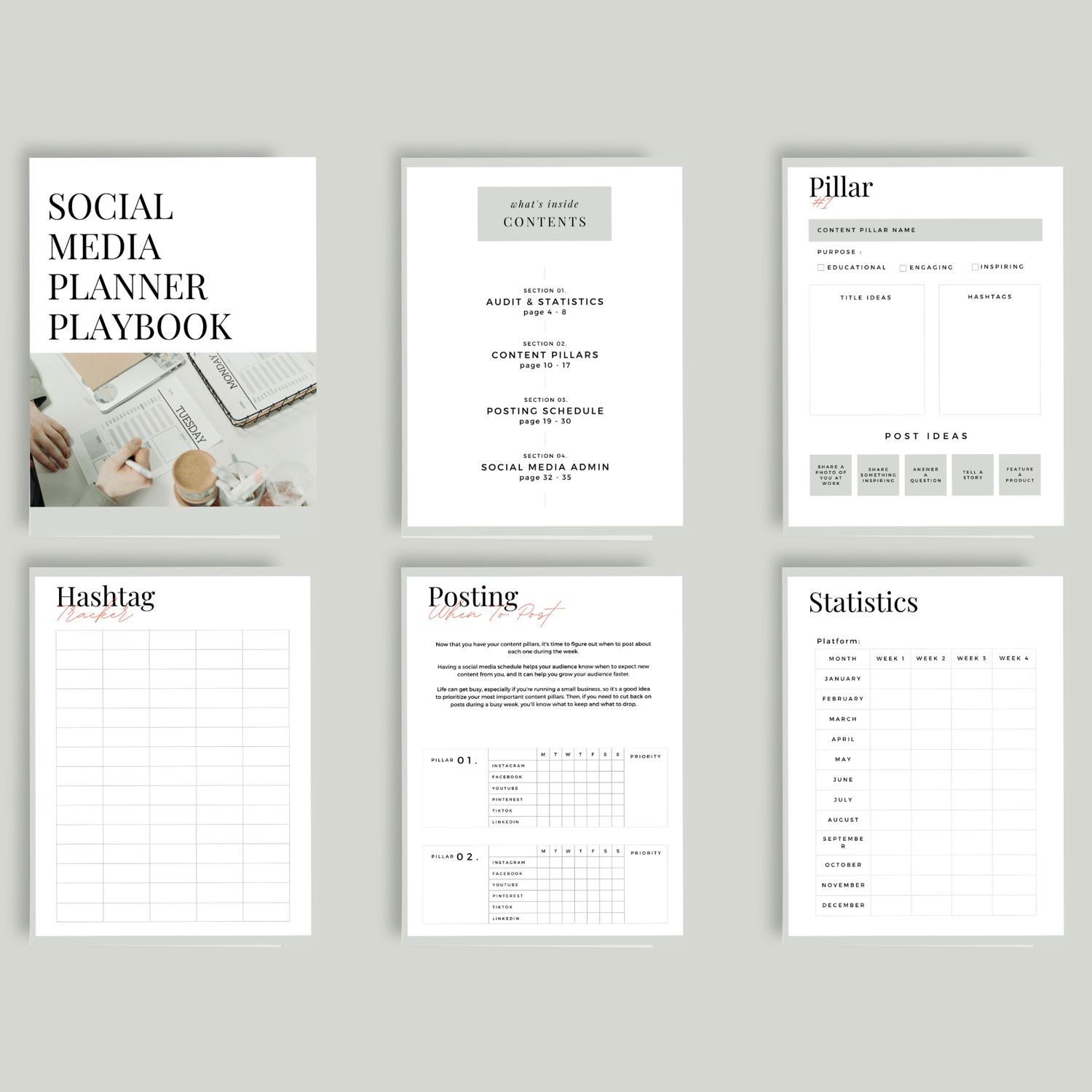 The Social Media Planner Playbook is your one-stop shop for planning and executing a successful social media strategy. It includes everything you need to audit your current social media presence, identify your content pillars, create a posting schedule, and manage your social media accounts efficiently.