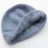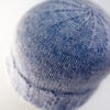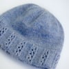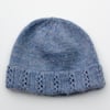 Techniques: cast on (long tail); bind off (sewn hat); knitting in the round; lace; yarn held tripe; folded hem