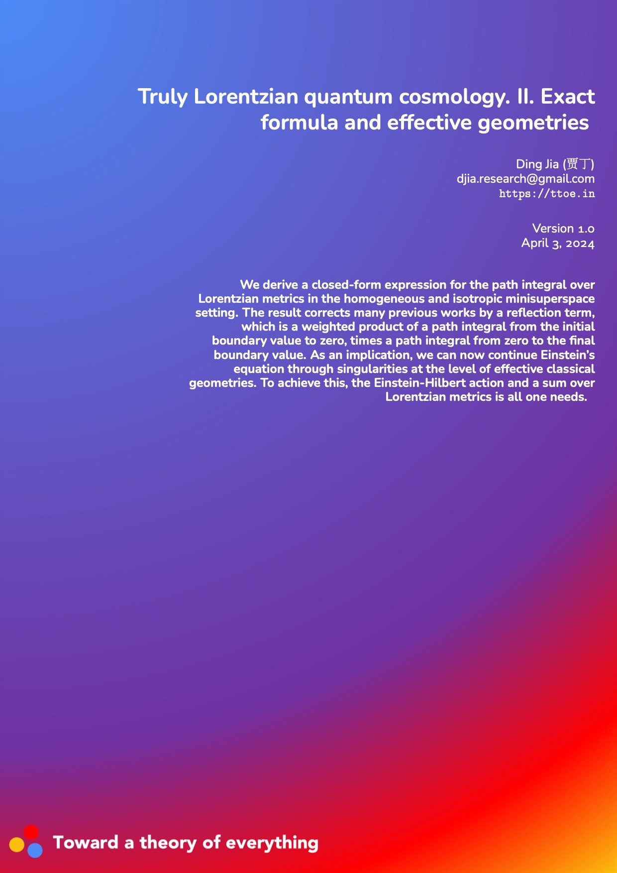 Abstract: We derive a closed-form expression for the path integral over Lorentzian metrics in the homogeneous and isotropic minisuperspace setting. The result corrects many previous works by a reflection term, which is a weighted product of a path integral from the initial boundary value to zero, times a path integral from zero to the final boundary value. As an implication, we can now continue Einstein’s equation through singularities at the level of effective classical geometries. To achieve this, the Einstein-Hilbert action and a sum over Lorentzian metrics is all one needs.