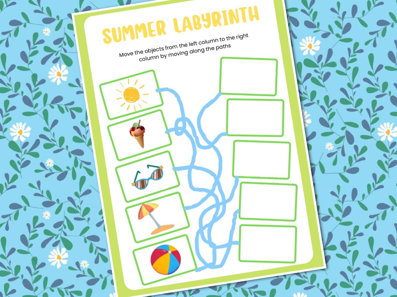 This task will help develop your child's attention and logical thinking. The task shows five pictures in frames with the theme “Summer”: a ball, ice cream, sun, umbrella, and sunglasses. Each frame with a picture is connected by a line to an empty frame (the interweaving of the lines forms a kind of “maze”). The child has to move the pictures from the frames on the left to the corresponding frames on the right, walking through the maze and determining which frame the picture should be redrawn in. The task will also contribute to the development of fine motor skills.
