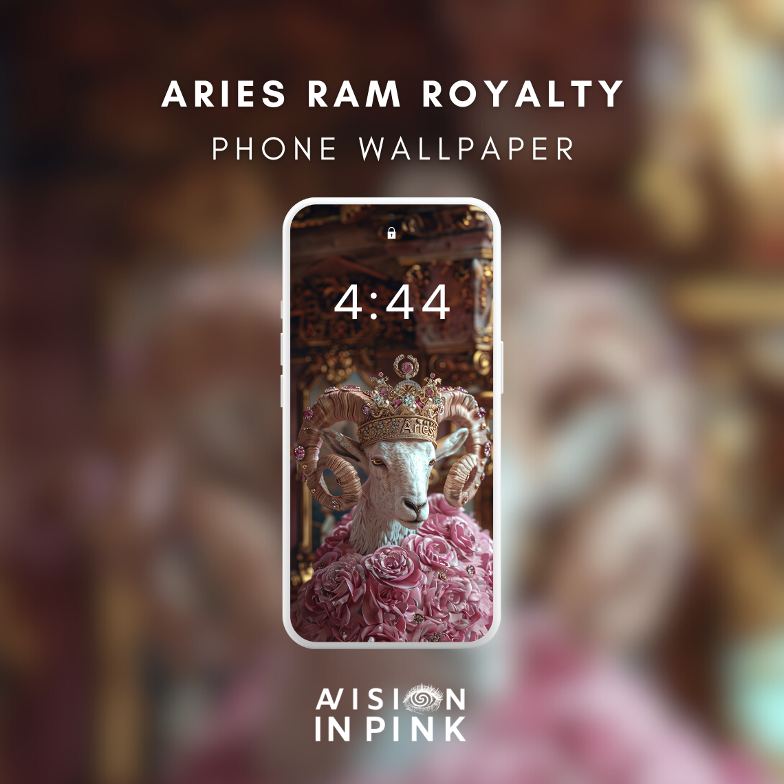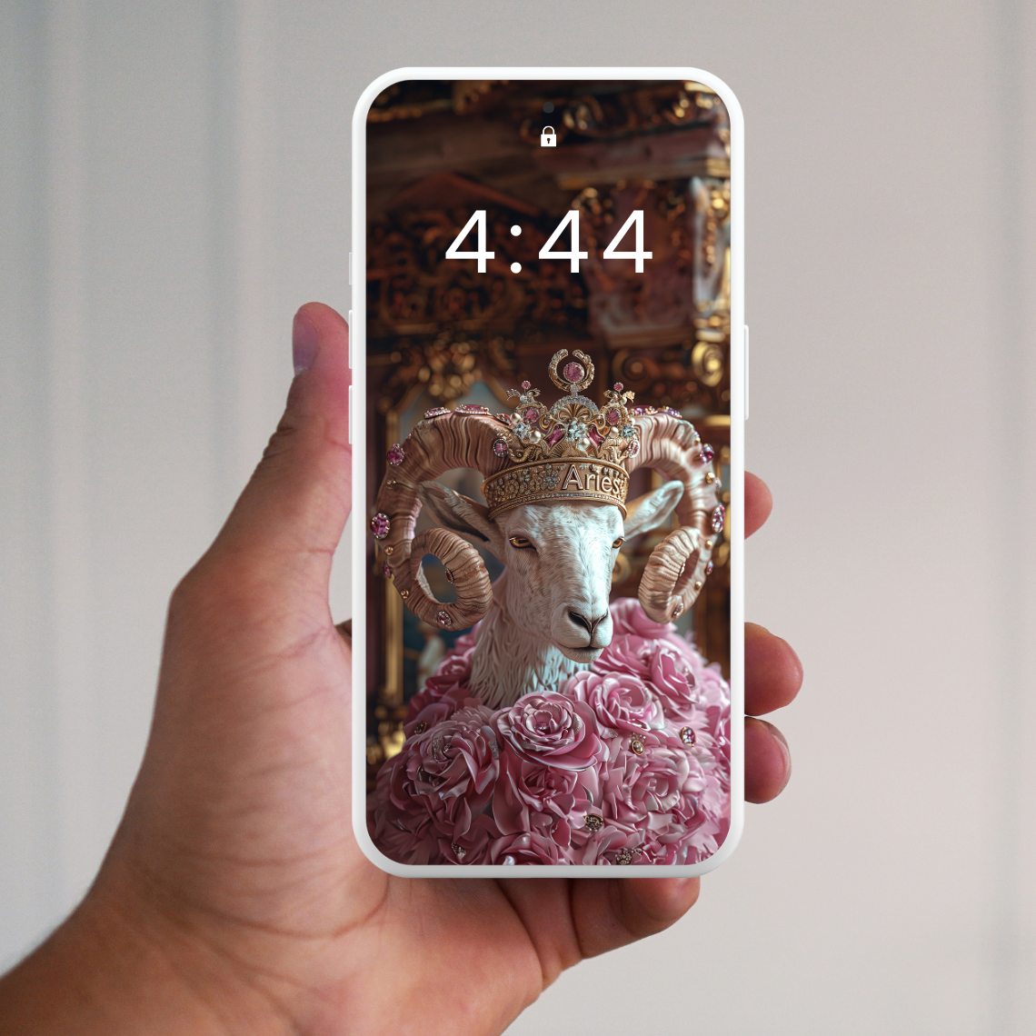 Description: This captivating phone wallpaper showcases a majestic white ram adorned with an opulent gold and pink crown, emblazoned with the word "Aries." The crown is intricately designed, featuring sparkling gemstones, pearls, and ornate patterns that emphasize luxury and grandeur. The ram's impressive spiraled horns are embellished with pink and gold accents, complementing the regal aesthetic. Surrounding the ram is a lush arrangement of vibrant pink roses, adding a soft, romantic touch to the composition. The background features a richly detailed, elegant setting that enhances the overall sophistication. This visually stunning image perfectly embodies the Aries zodiac sign's strength and refinement.