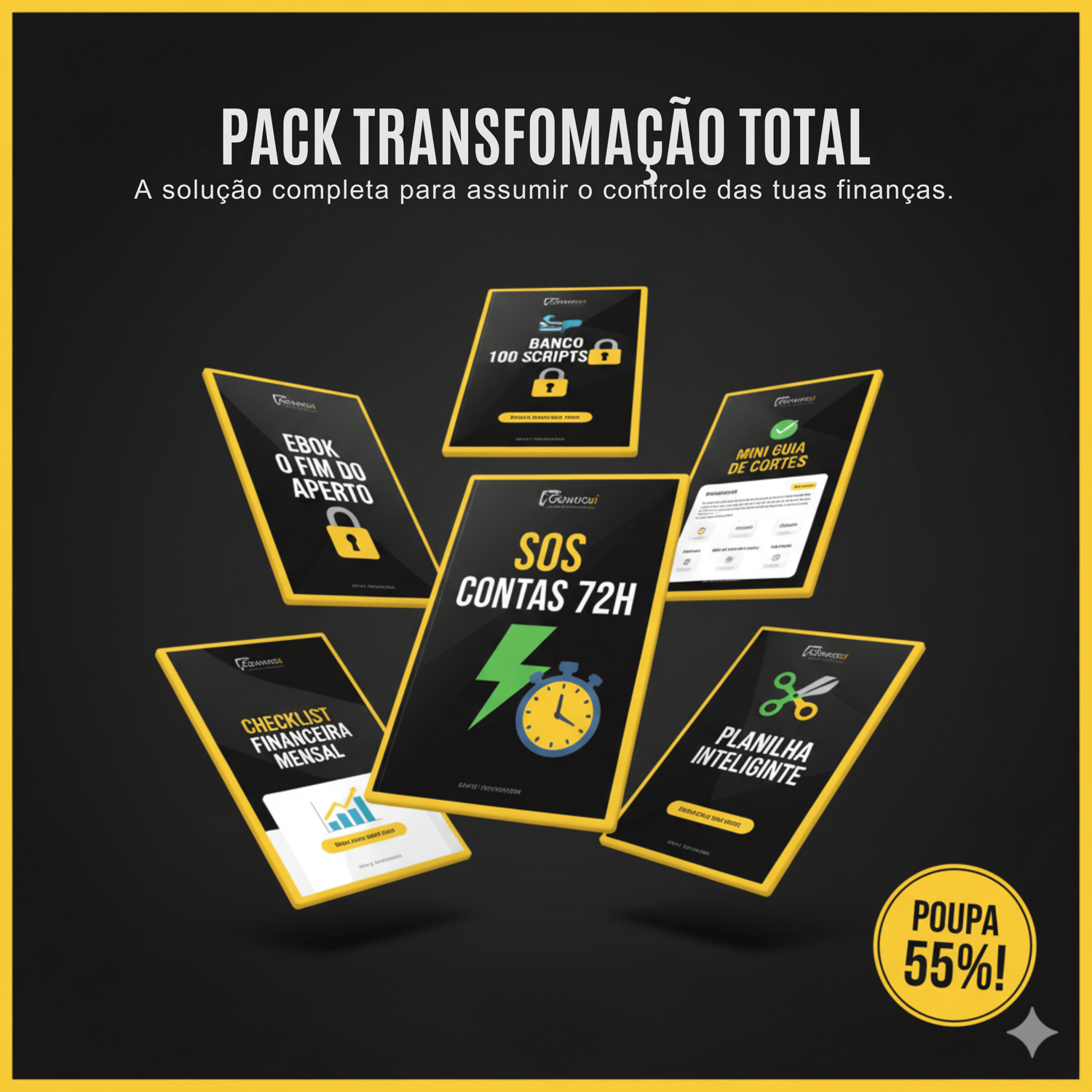 O Pack Transformação Total não é só mais um curso ou guia. É o arsenal completo que te vai tirar do aperto, dar-te poder de negociação e garantir a tua liberdade financeira, de uma vez por todas.