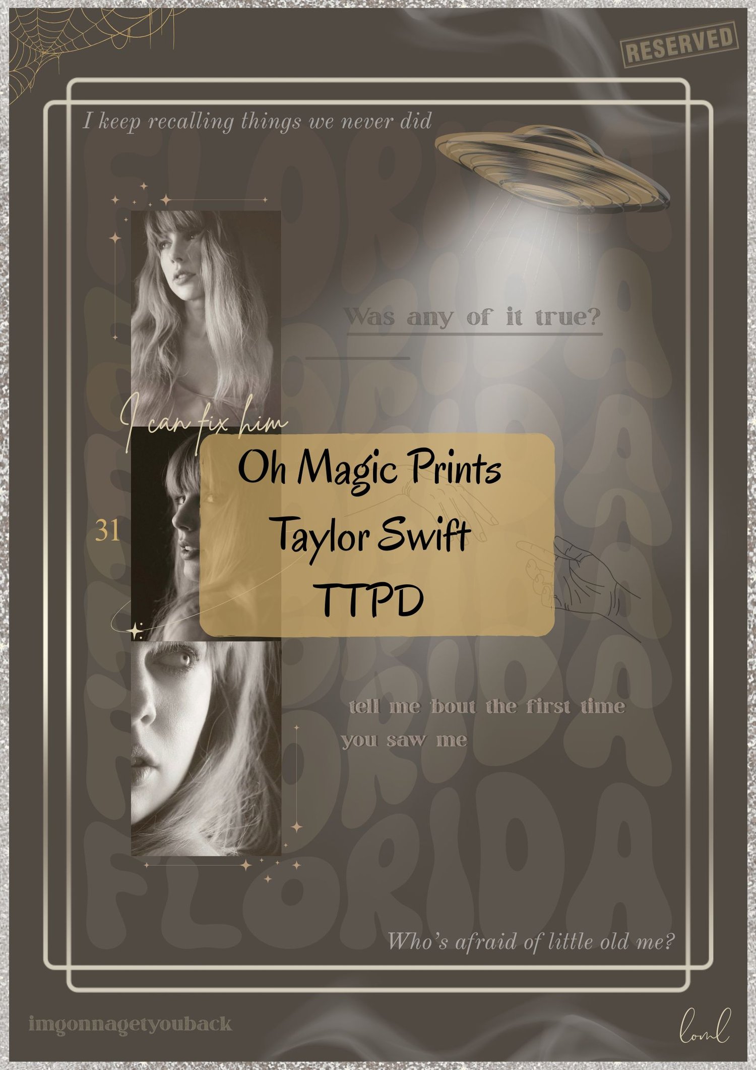 This Tortured Poets Department-inspired digital art print captures the sharp elegance and emotional weight of a 31-track epic. Minimalist in layout but rich in meaning, the piece features subtle gold detailing, soft neutral textures, celestial accents, and surreal nods to standout tracks like “The Smallest Man Who Ever Lived,” “Florida!!!” and “I Can Do It With a Broken Heart.”