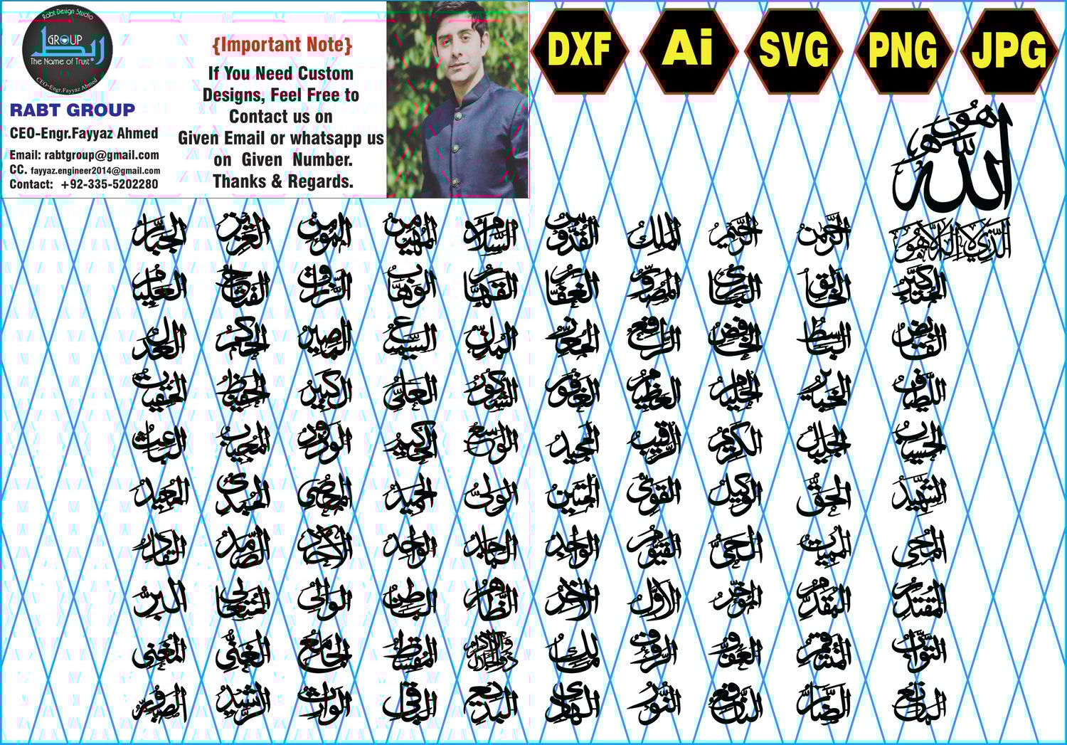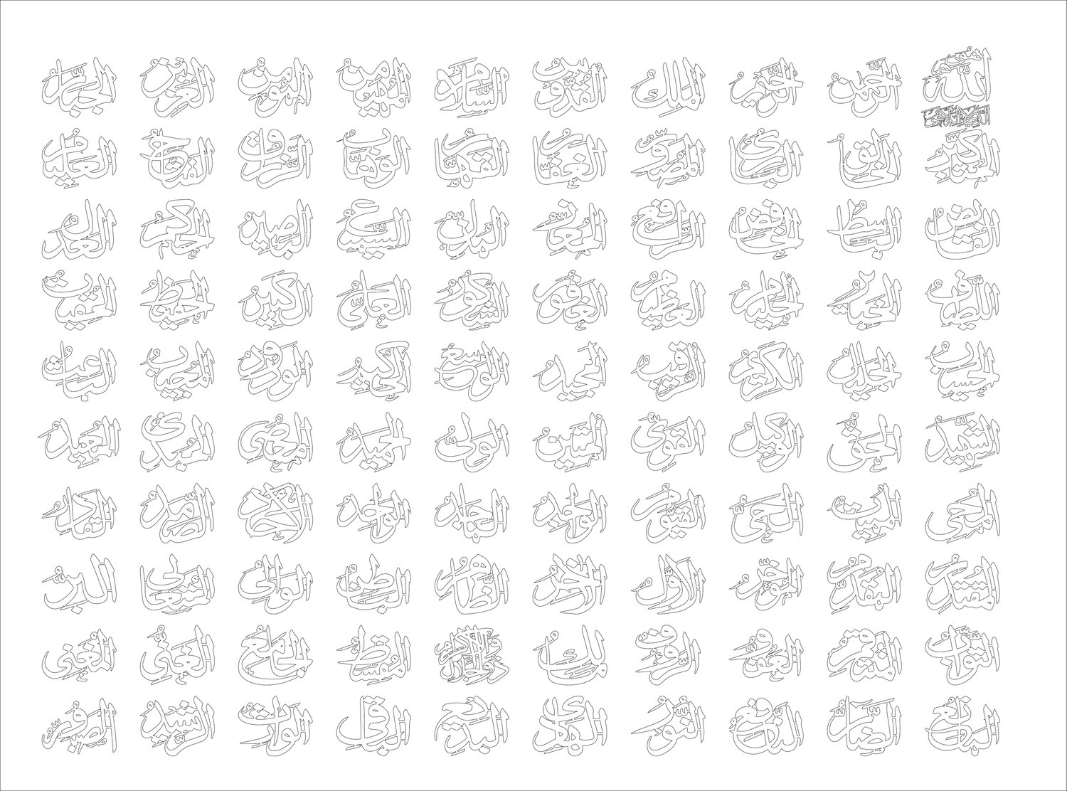 Elevate your CNC and laser cutting projects with this professional set of 99 Names of Allah (Asma Ul Husna) designed in a rectangular layout. Each name is meticulously crafted in clean Arabic calligraphy, formatted for precise cuts using CNC routers, laser cutters, plasma, and waterjet machines.
