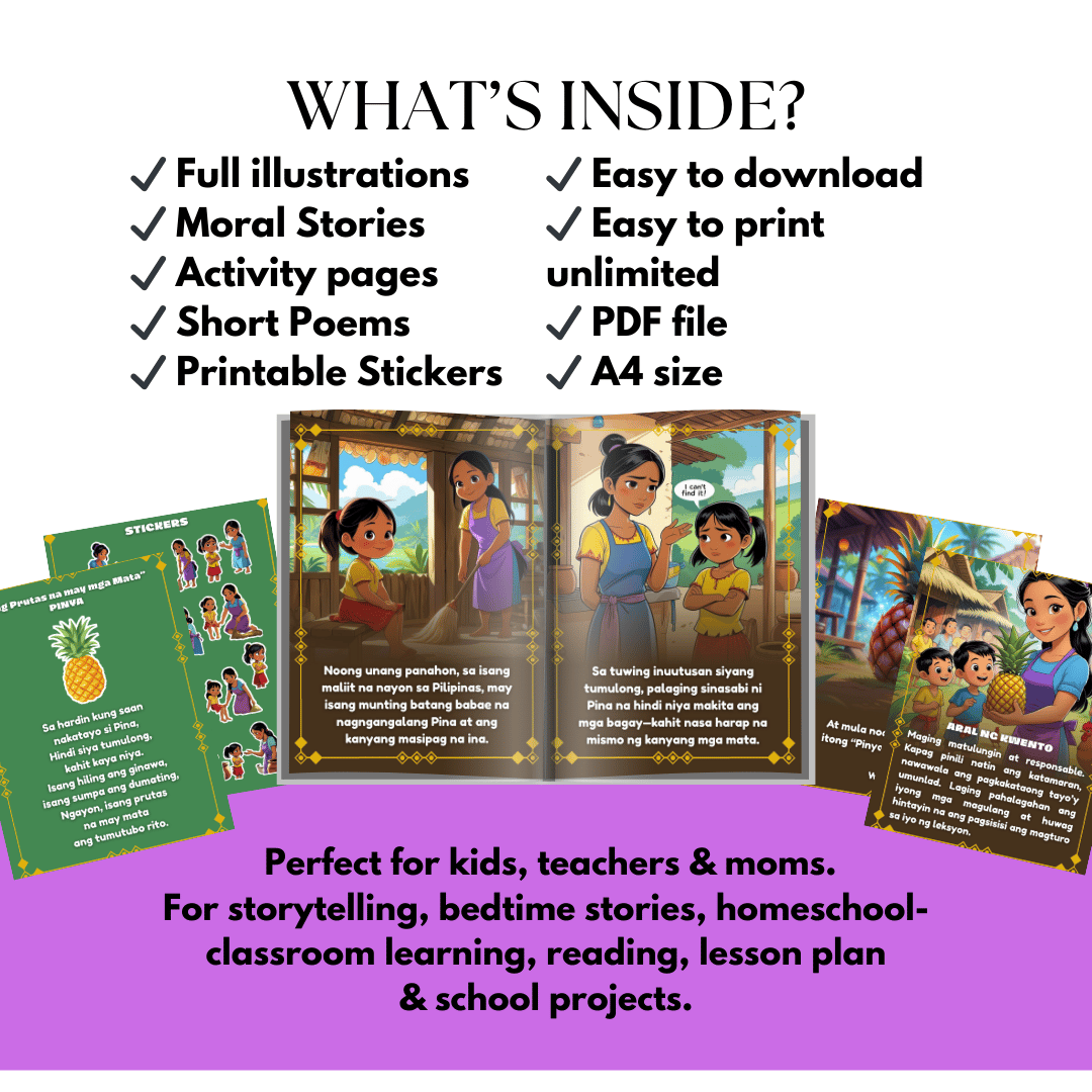 Isang klasikong kuwentong-bayan ng Pilipinas tungkol sa isang batang babae na ayaw makinig at laging umaasa sa tulong ng iba. Isang araw, ang hiling ng kanyang ina ay nagbunga ng isang mahikang pagbabago—siya ay naging prutas na may maraming “mata.” Isang makabuluhang kuwento na nagtuturo ng pagsunod, pananagutan, at pasasalamat sa paraang banayad at madaling tandaan ng mga bata. 📖🍍