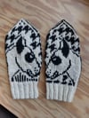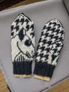 These mittens feature a Bull Terrier on a backdrop of houndstooth patterning. Because they use aran weight yarn, it’s a very speedy knit!
