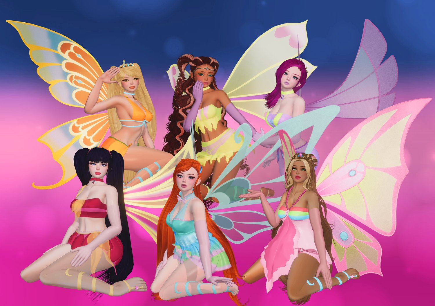 I have been working on these avis since August, its now October lol. I am honestly so stoked and excited to finally release them. I made the Enchantix and casual outfits, enchantix sandals and wings all by myself from scratch.. not to toot my own horn or anything, I am simply proud of myself. I didn't think I could do it, but I did, multiple nights of crying about how hard it was to make flora's dress, bloom's dress and musa's shorts were totally worth it. They all came out so beautiful. I truly truly hope you love them! The only parts of the outfits I didn't make are the casual outfit shoes and the hairs. Though the hairs are all heavily edited.