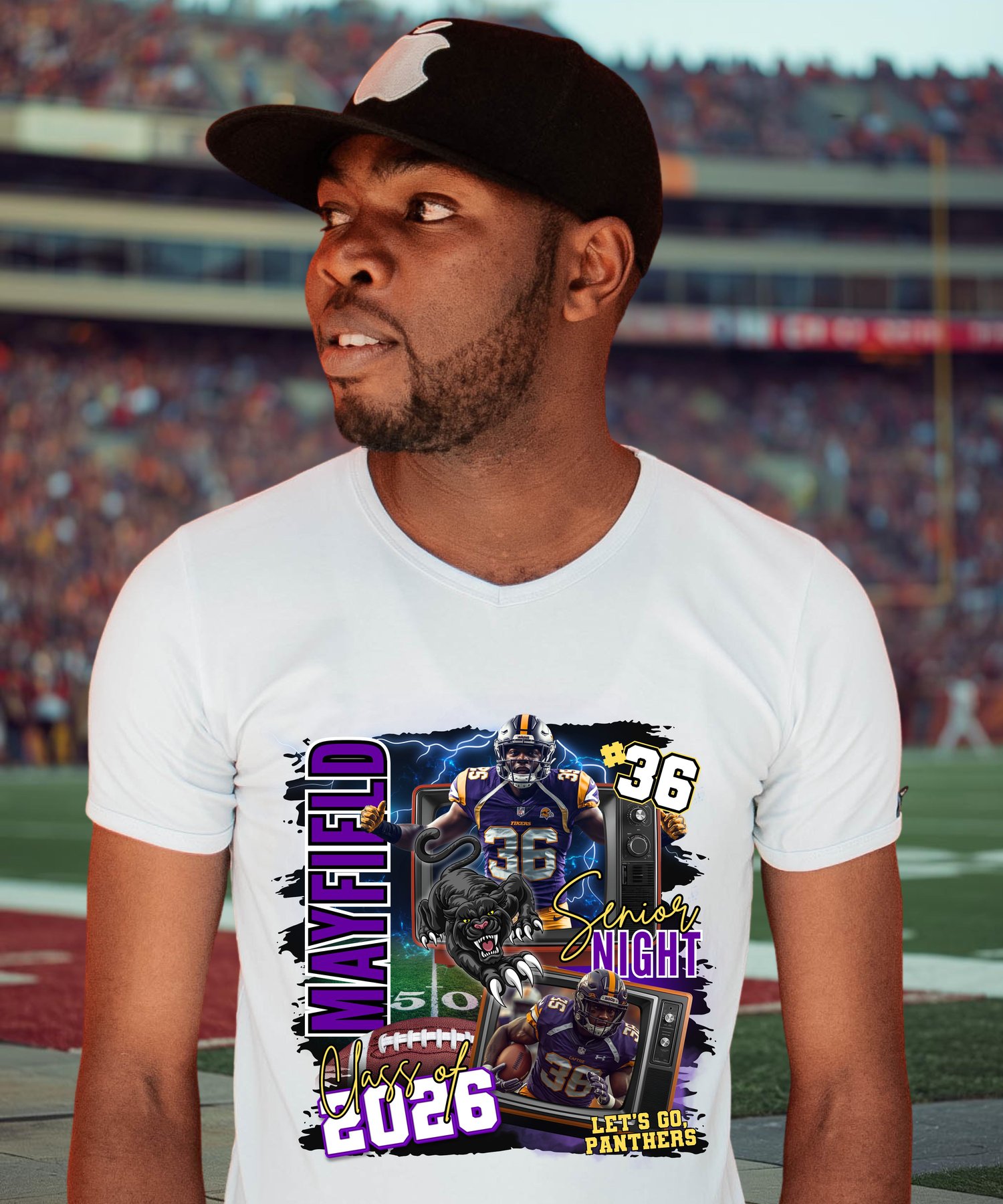 Bring the Friday night lights to life with this bold and dynamic football spirit design! This design screams school pride. Perfect for family and fans who want to represent in style. Add your own name, number, and school colors to make it truly yours. Put this design on tshirts, sweaters, jerseys, totebag, and more.