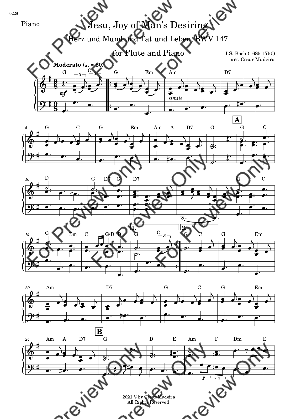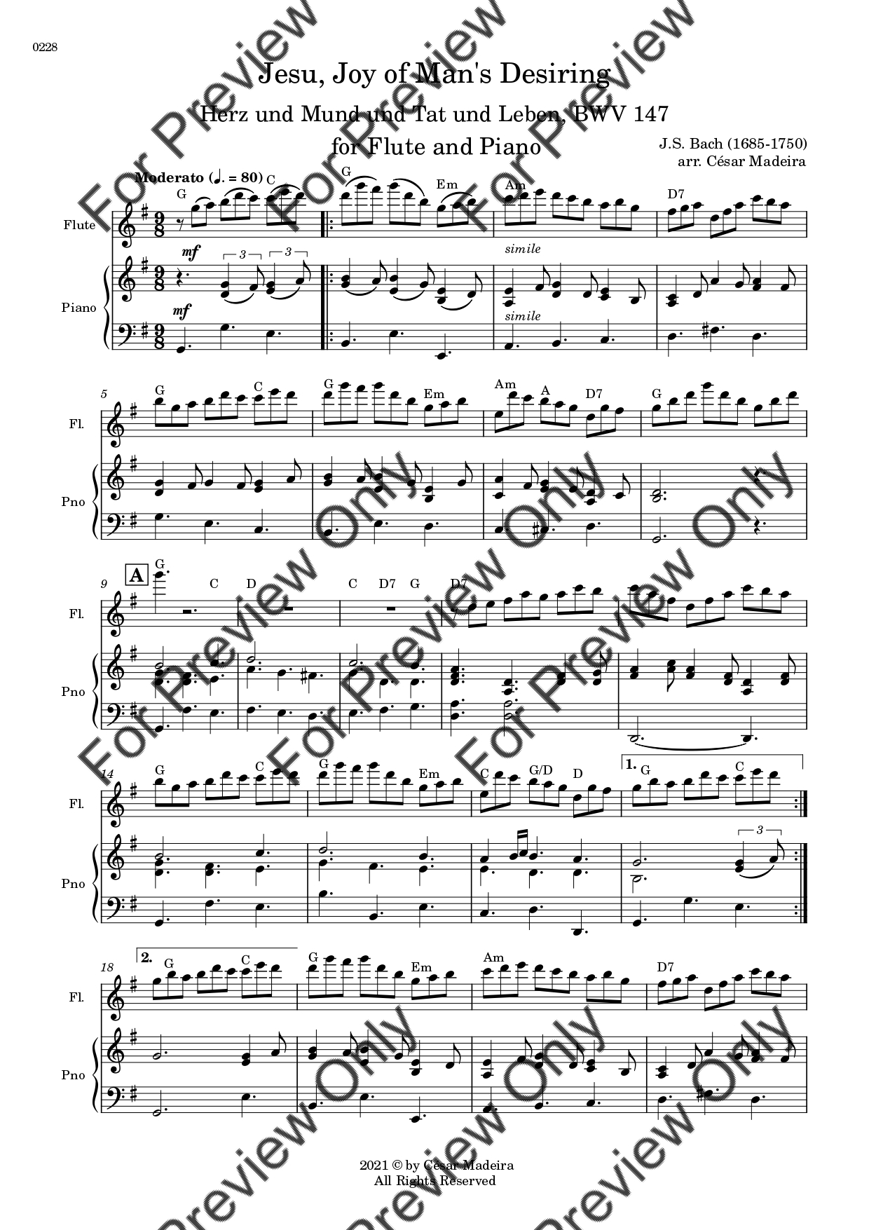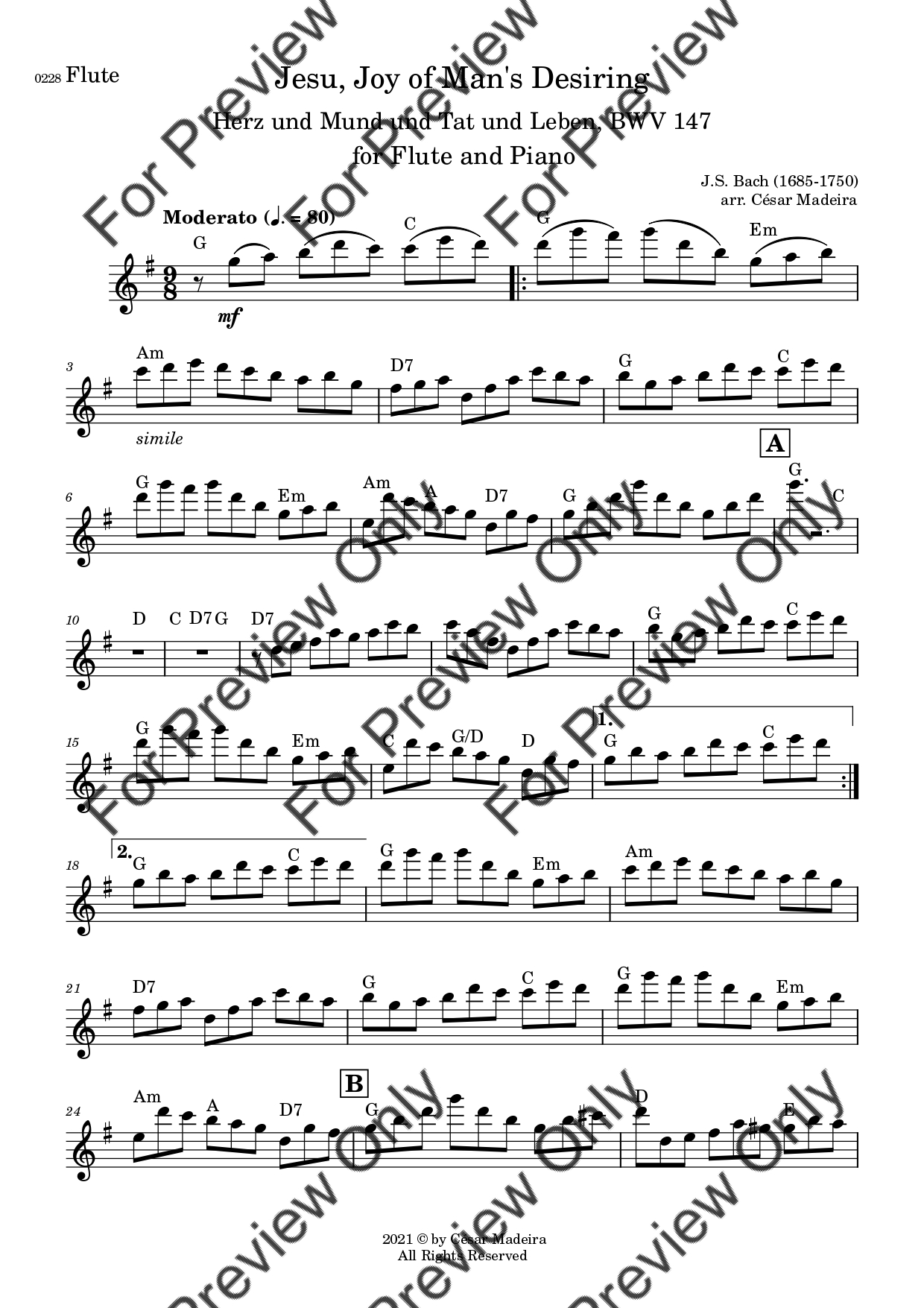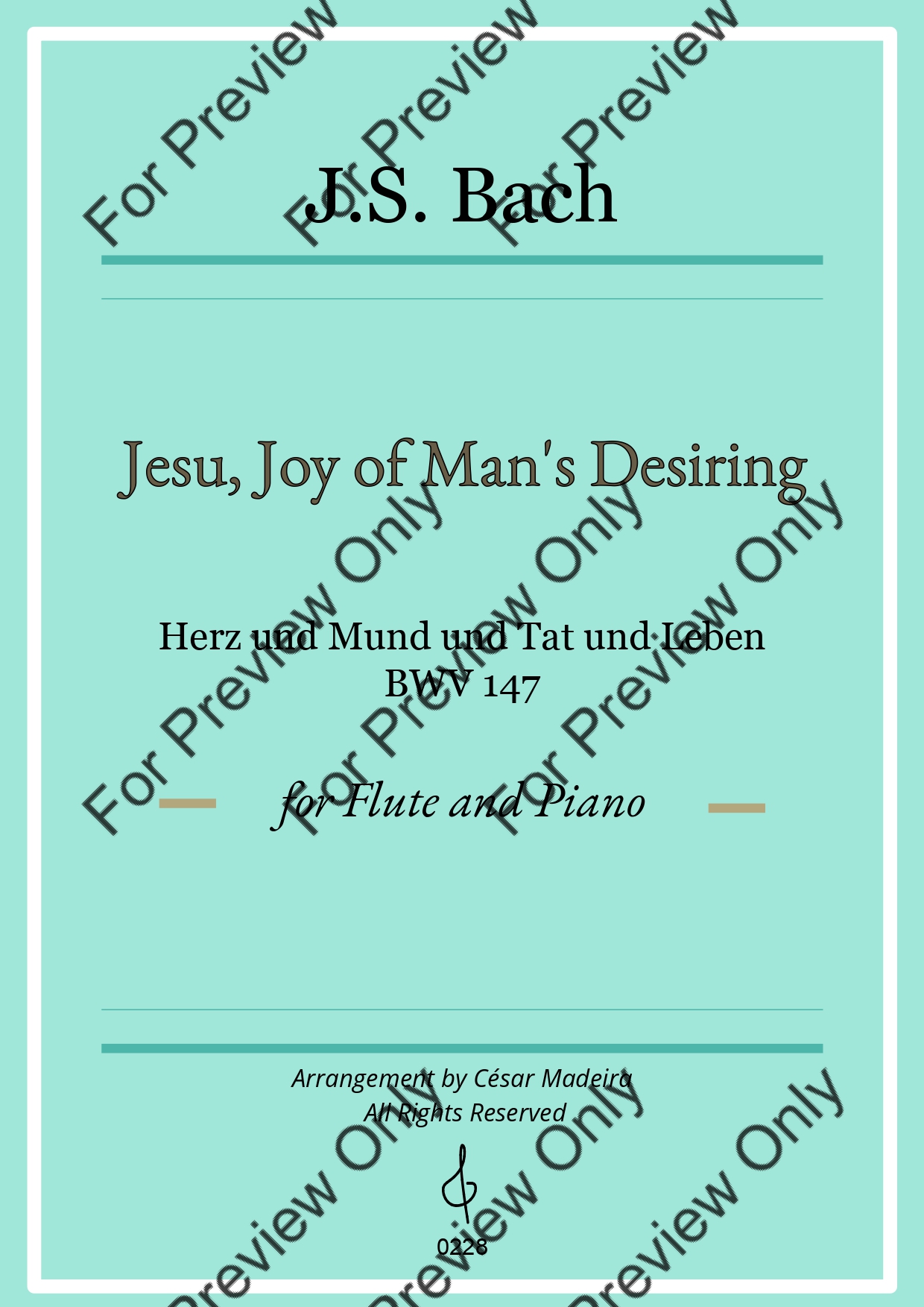 Jesu, Joy of Man's Desiring, BWV147 by Johann Sebastian Bach. Arrangement for Flute and Piano. With Full Score and Individual Parts with Chords. Have fun!