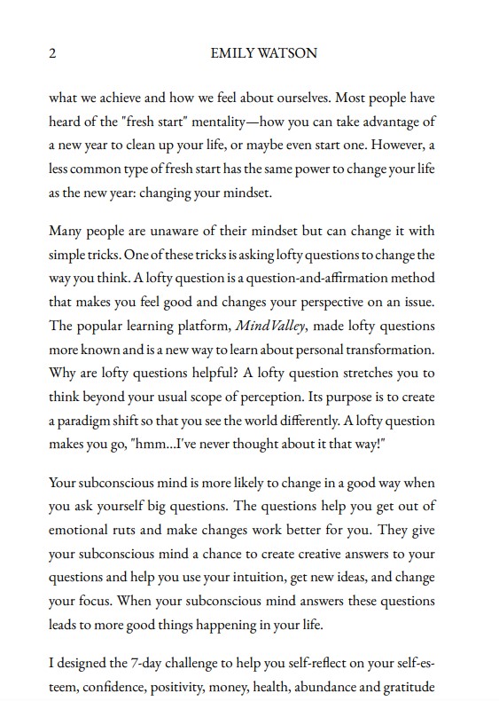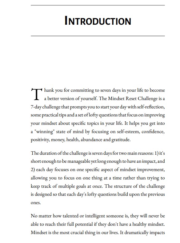 This book is the perfect guide for anyone who is looking to make a positive change in their life and become a better version of themselves. It will help you reset your mindset and open up the possibilities of achieving your dreams, no matter who you are or where you are in life. The book includes practical tips and a set of lofty questions to help you get into the right mindset for the day, reframe how you think about an issue and make meaningful changes in various areas of your life. To get the most out of the book, readers are given a 7-day challenge to improve their mindset about self-esteem, confidence, positivity, money, health, abundance and gratitude. Along with the book, readers will also receive a bonus book to help them become a better version of themselves by guiding them to change their habits. So, take the leap and become a stronger person today with this challenge.