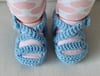These 8ply garter stitch, sling back sandals have crossed, buttoned foot straps, and a toe strap knitted sideways.