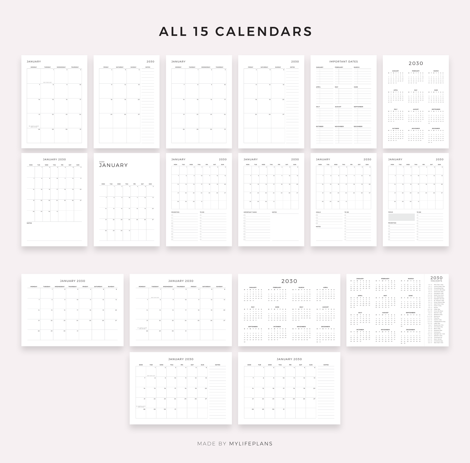 2030 calendar bundle. It includes 15 unique printable calendars to choose from. Just download, print and get started right away!
