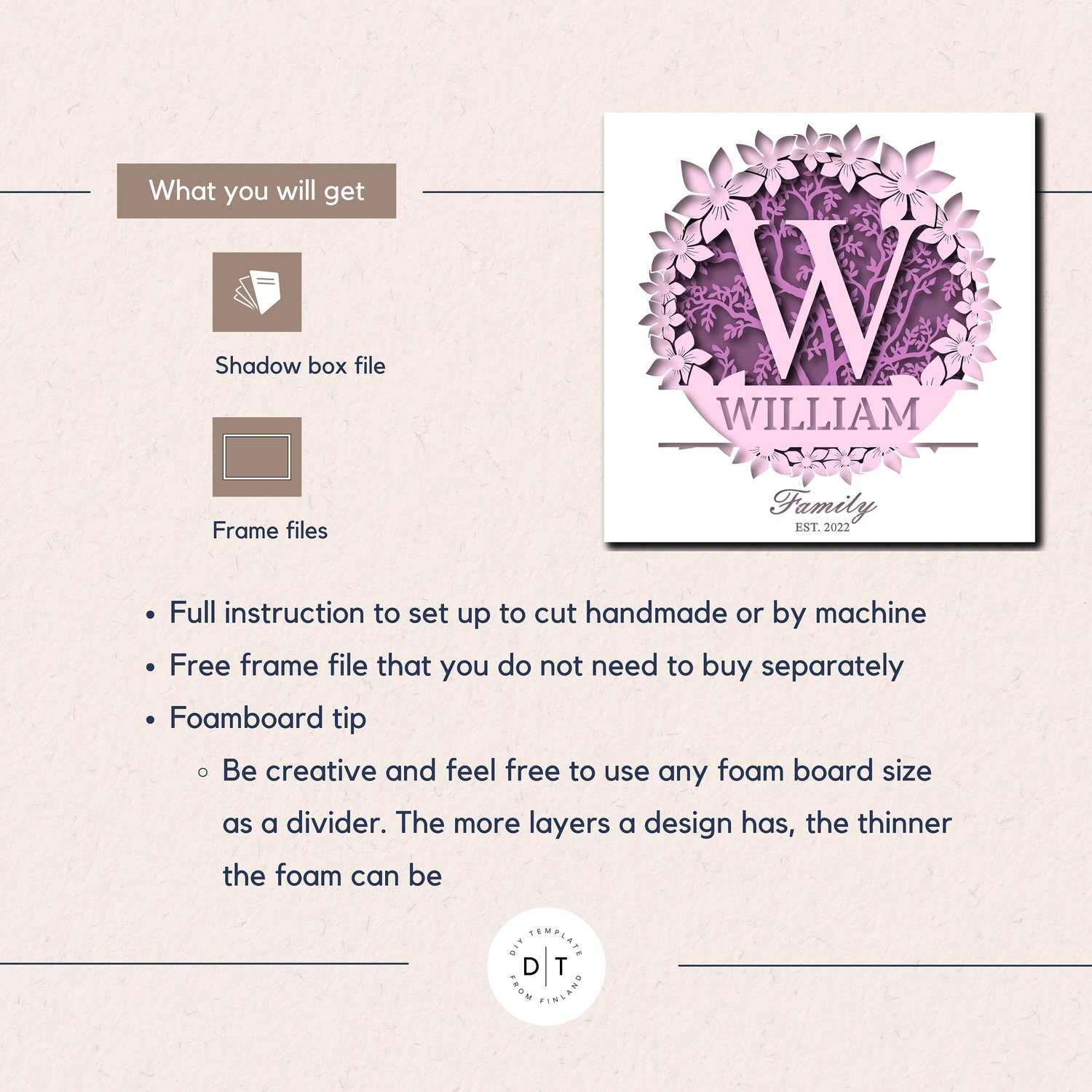 A PDF with instructions for easy shadow box making. The size of this design is 8.3 x 8x3 inch which fits perfectly for our shadowbox frame which is included for free.
