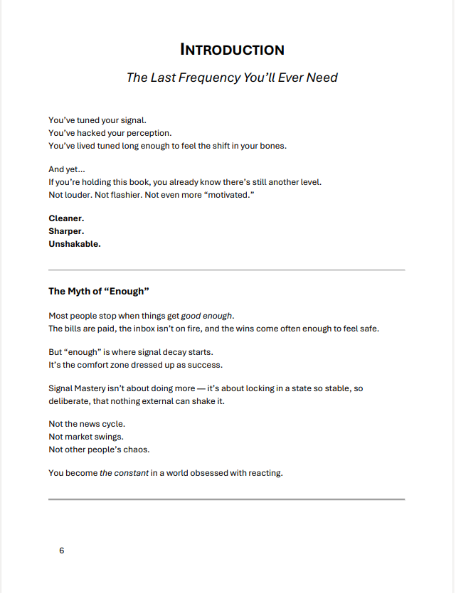 Signal Mastery is the final step: not louder, not flashier—cleaner. You don’t “get into state”; you become the state. This book gives you the blueprint to raise your floor so high that even your off-days outperform other people’s peaks. You’ll build structural integrity (habits, environments, relationships) that carry you when willpower won’t, harden your signal immunity so noise can’t hijack your focus, and learn to run an offensive signal that tilts rooms before you speak. Then you’ll lock it in with the Permanence Protocol—identity-level shifts, environment fusion, and automatic triggers—so drift becomes impossible. Finally, you deploy mastery in the world with a 30/90-day plan that makes your presence a quiet inevitability.