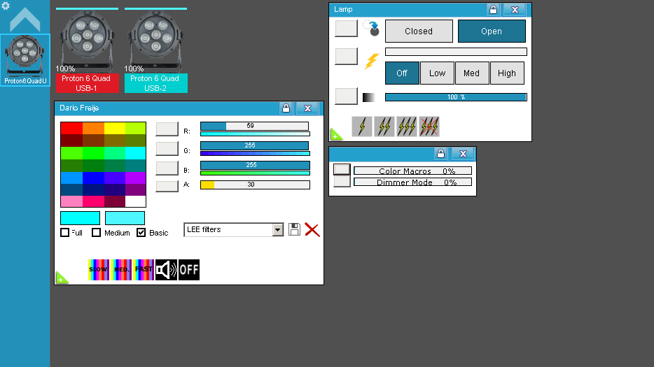 - Sliders para Color Macros y Dimmer Mode.