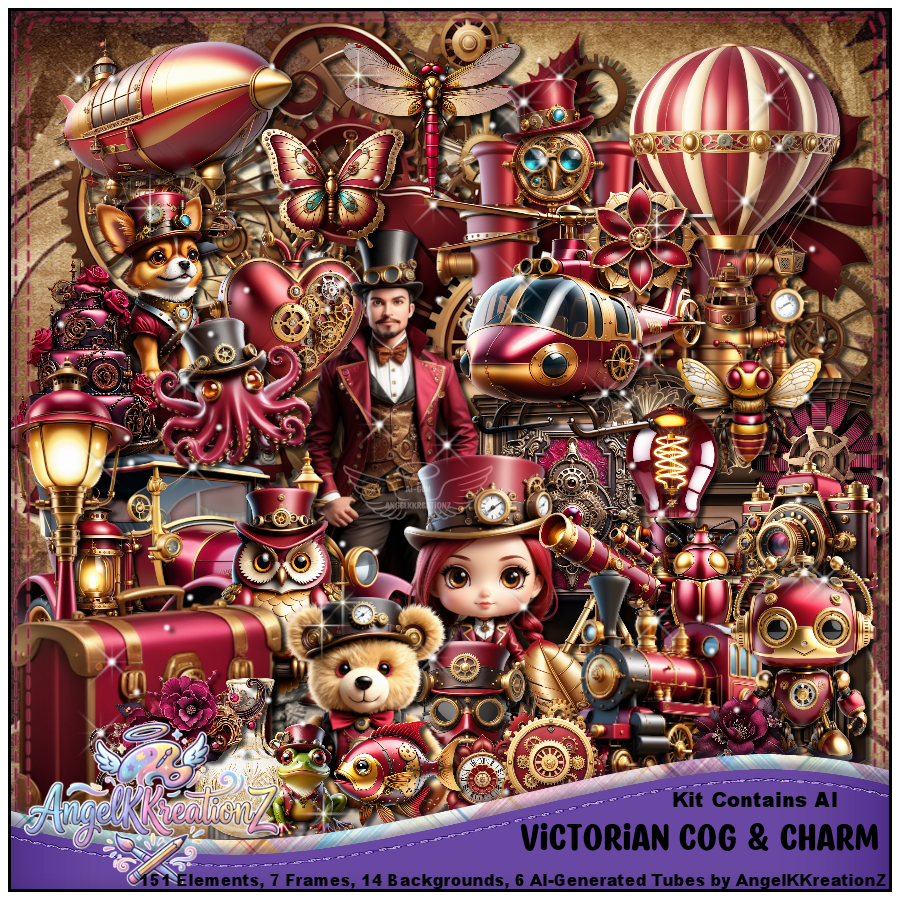 Meet dapper inventors, charming chibi adventurers, and enchanting mechanical companions—owls, bears, foxes, dragonflies, and even a monocled octopus—all dressed in polished brass and velvet finery. Ornate timepieces, glowing Edison bulbs, hot air balloons, locomotives, and layered gears create a storytelling playground perfect for layouts bursting with elegance and imagination.⚙️