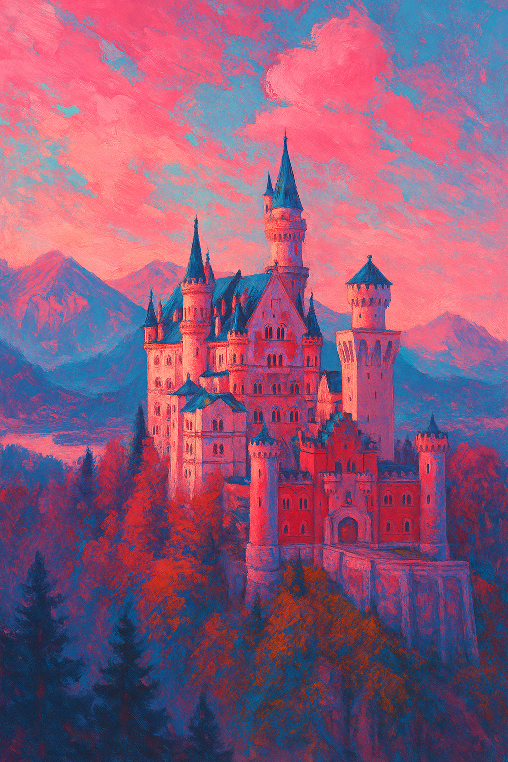 Bavaria: Dreamtowers in Rose Mist invites the viewer into a fairytale landscape where the legendary Neuschwanstein Castle rises through delicate pink and blue haze. Towering above alpine forests and hidden valleys, the castle's spires shimmer in soft pastel tones, as if floating in a dream. The sky blends rose, lavender, and sky blue in sweeping, surreal motion — transforming the Bavarian mountains into a canvas of serenity and wonder.