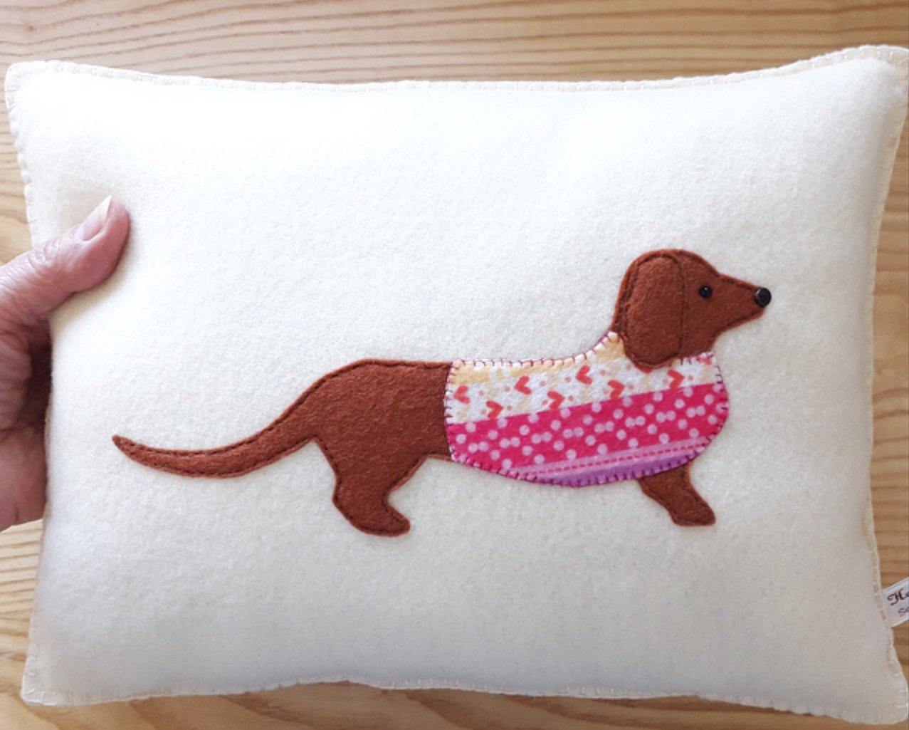 This delightful dachshund mini pillow is quick and easy to create using plain and patterned felt. It will look lovely anywhere in the home and make the perfect handmade gift idea for dachshund lovers!