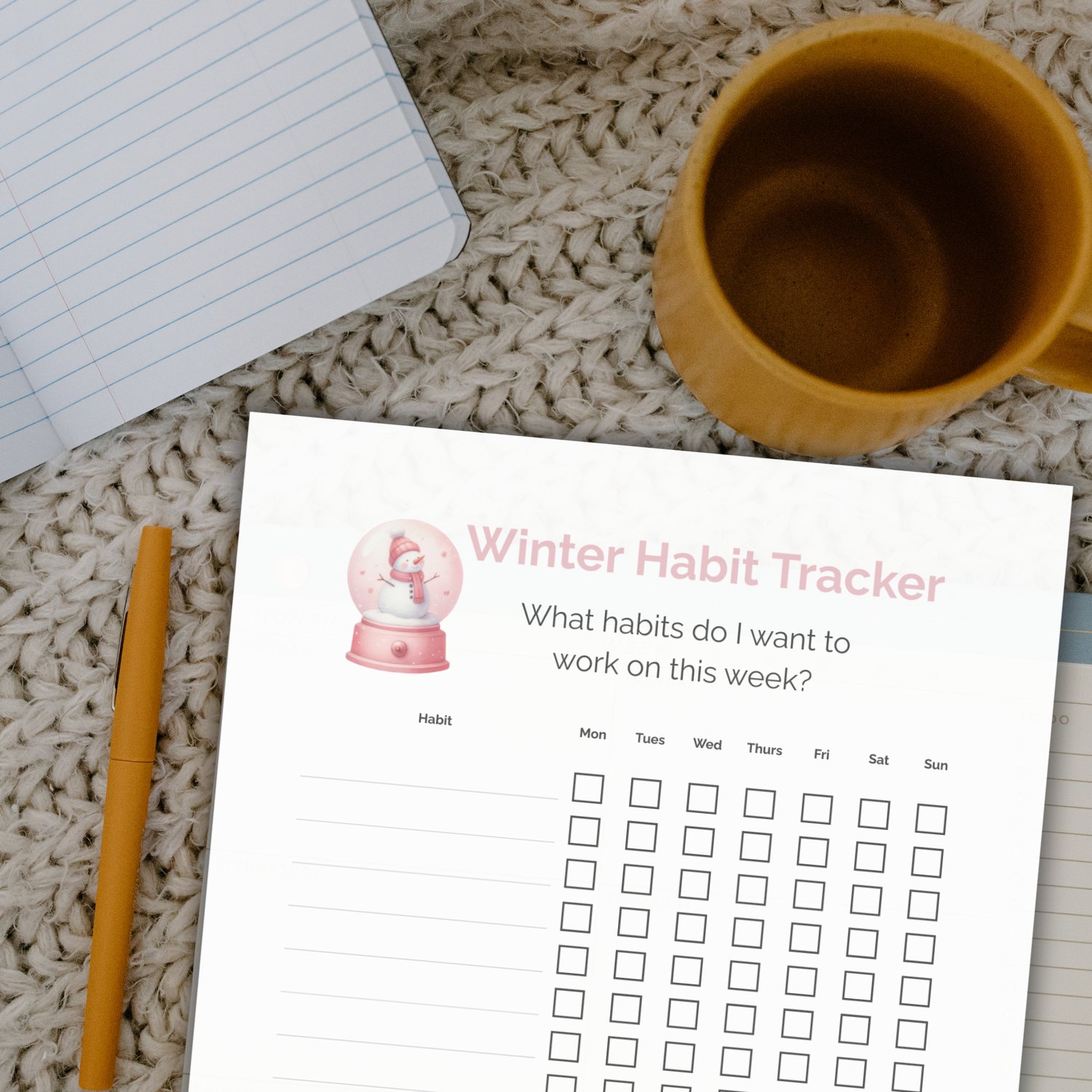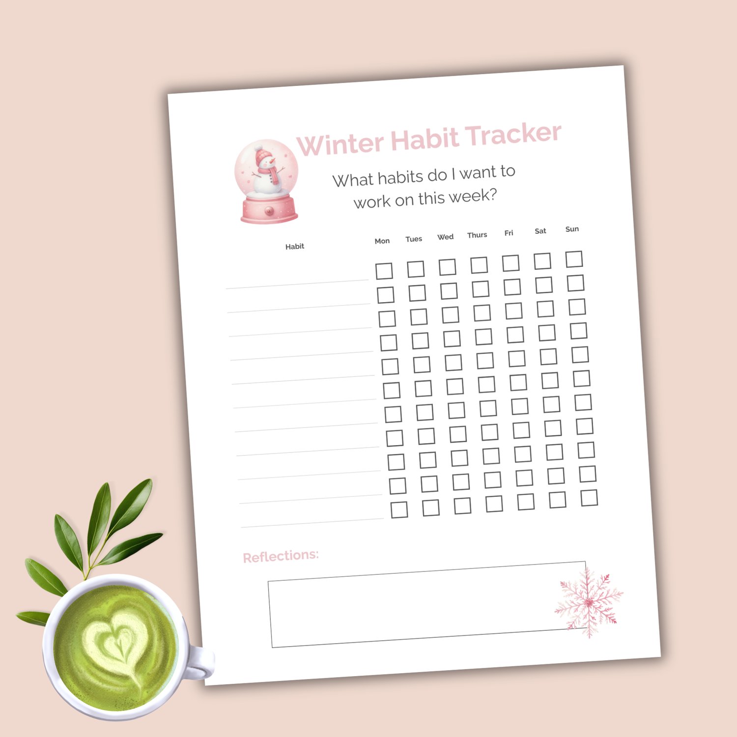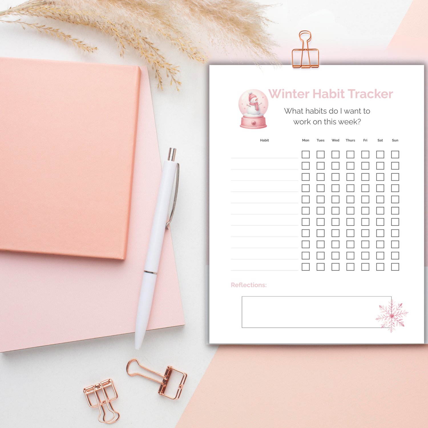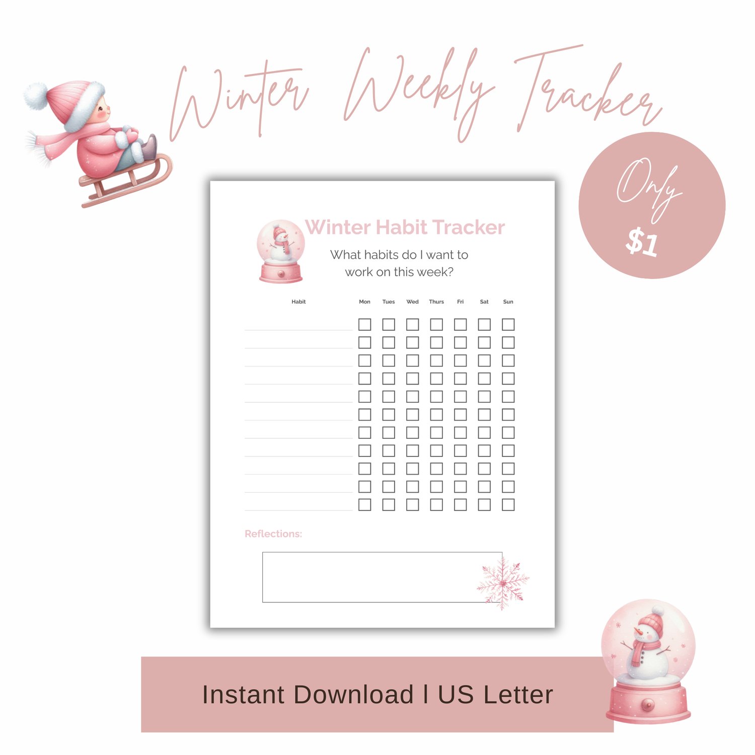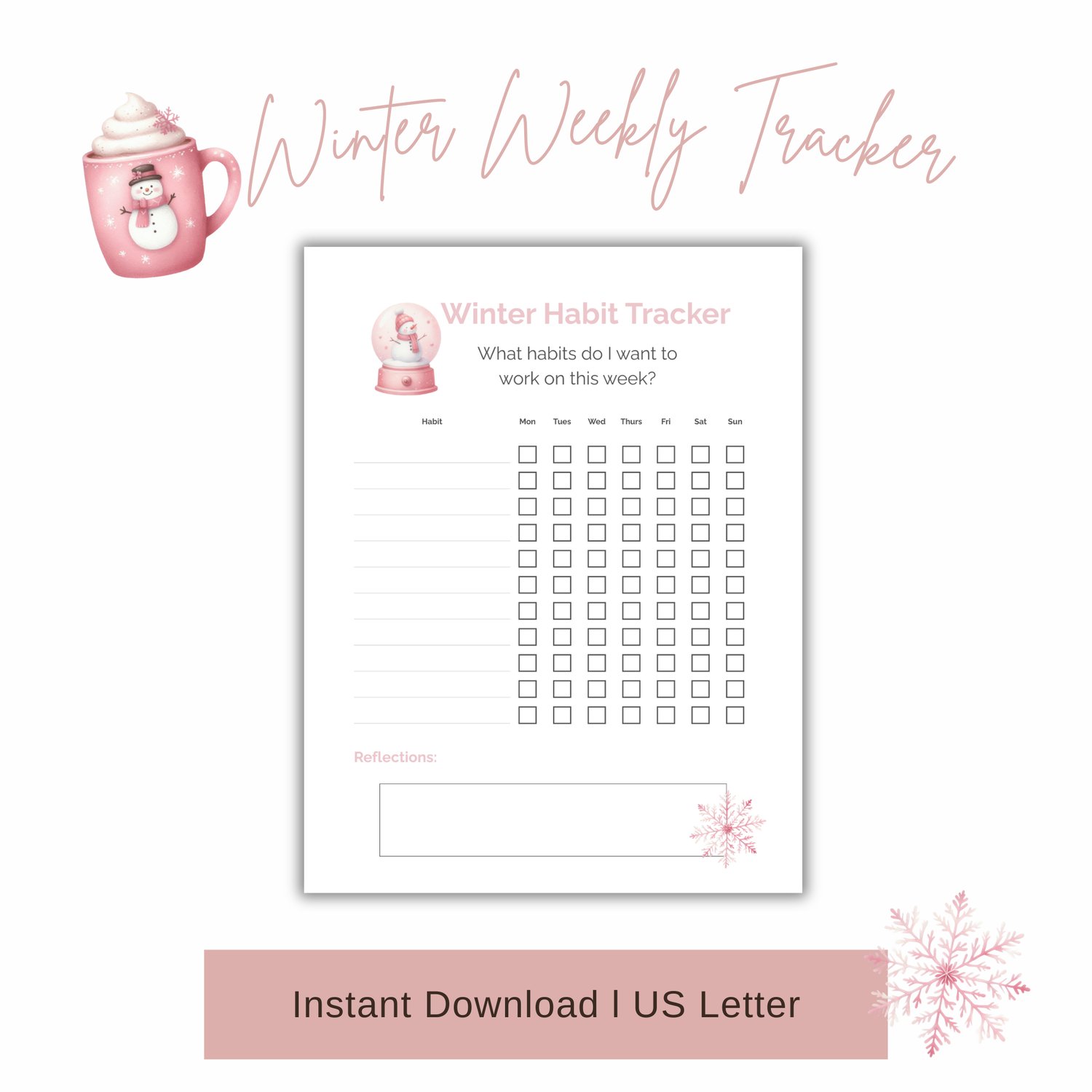 Stay motivated with this Winter Weekly Habit Tracker, featuring a watercolor pink snowflake and adorable snowman snow globe. Track your goals, check off your progress, and use the reflections section to celebrate your wins!