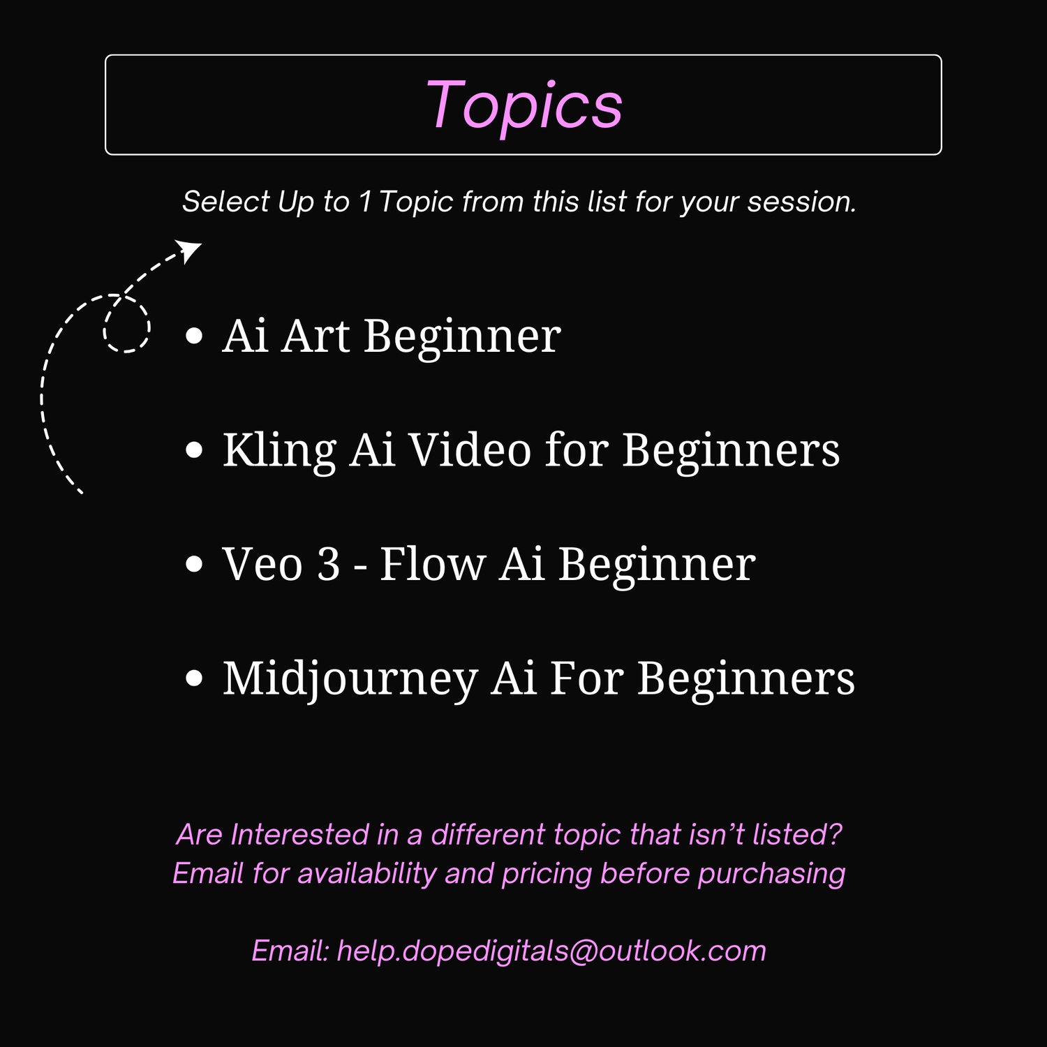 - (For other topics, email help.dopedigitals@outlook.com before booking.)
