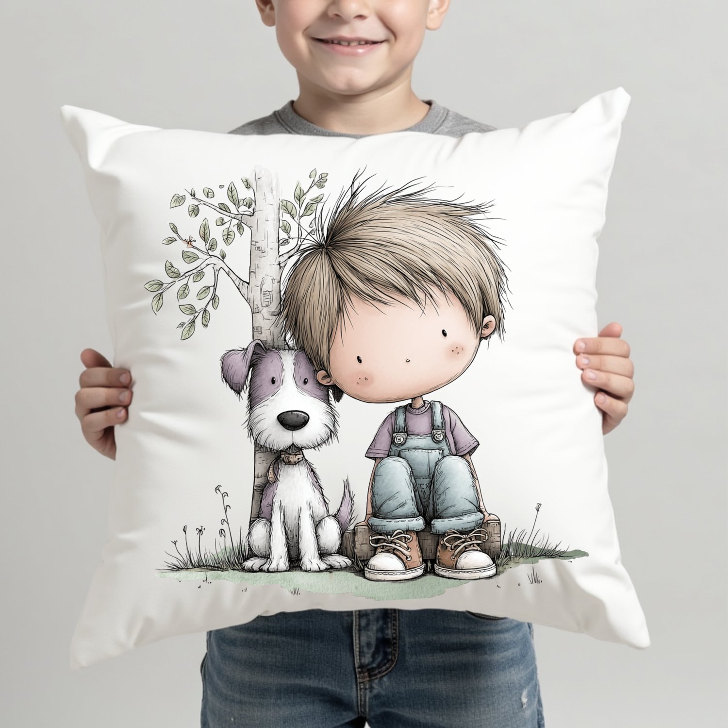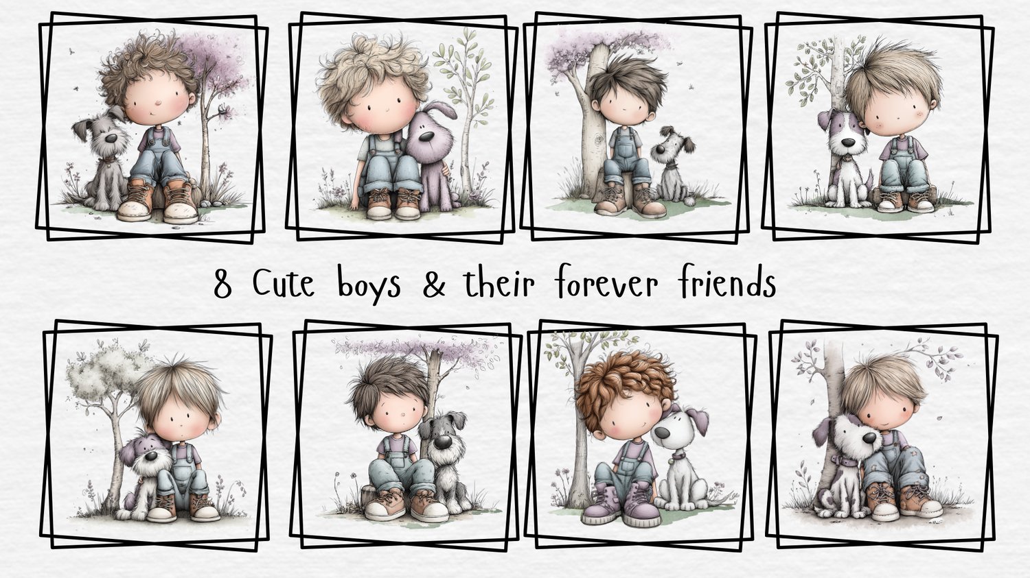 This collection features 18 lovingly hand-drawn-style illustrations of boys and girls sitting with their furry companions—perfect for nursery decor, kids’ apparel, stationery, invitations, and handmade gifts.