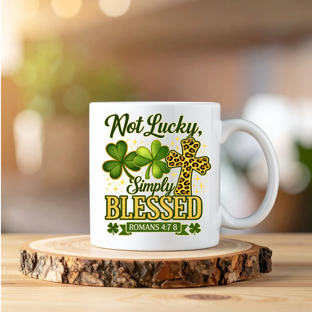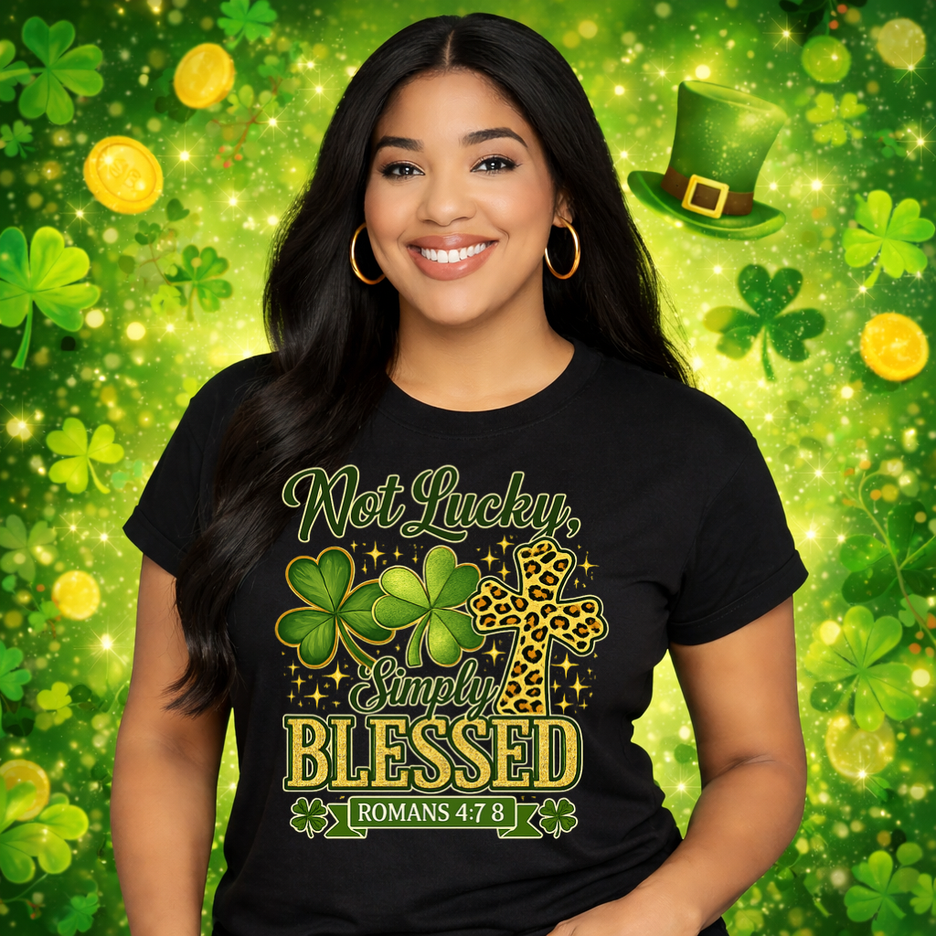 Celebrate faith and favor with this “Not Lucky, Simply Blessed” St. Patrick’s Day design. Featuring shamrocks, a stylish cross, and Romans 4:7–8, this high-quality DTF/sublimation transfer delivers vibrant color, crisp detail, and long-lasting wear—perfect for tees, sweatshirts, and seasonal faith-based apparel.