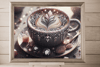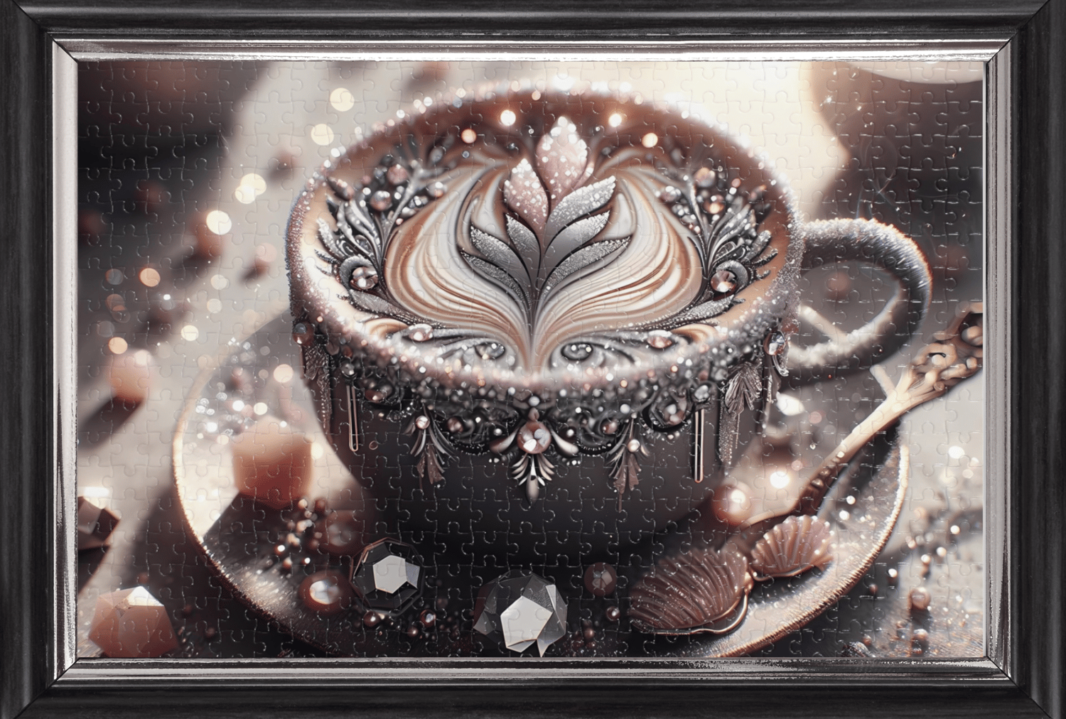 The central image of this puzzle is a sumptuously decorated mocha cup, its surface embellished with sparkling jewels and ornate silver filigree that seem to tell a tale of ancient craftsmanship. The frothy surface of the mocha within is artfully swirled into a floral pattern, reminiscent of a delicate latte art masterpiece. This intricate design is framed by the rim of the cup, which is dripping with crystalline beads and surrounded by a halo of mystical light.