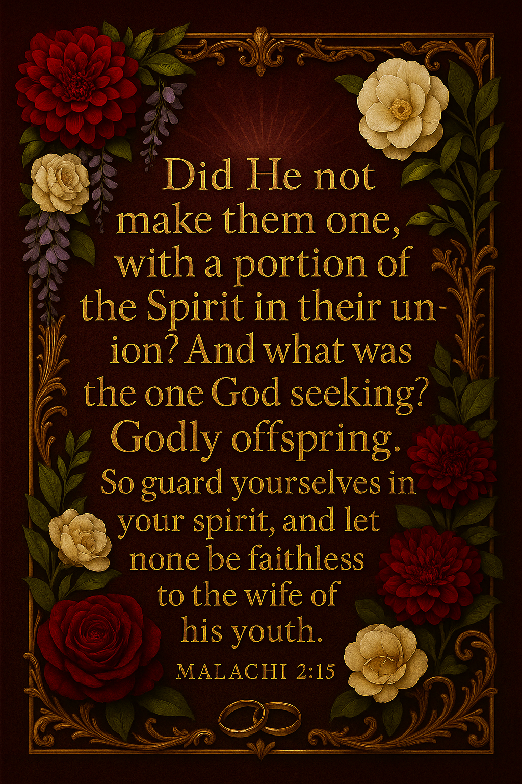 - Bible verse: “Did He not make them one, with a portion of the Spirit in their union? And what was the one God seeking? Godly offspring. So guard yourselves in your spirit, and let none be faithless to the wife of his youth.” – Malachi 2:15