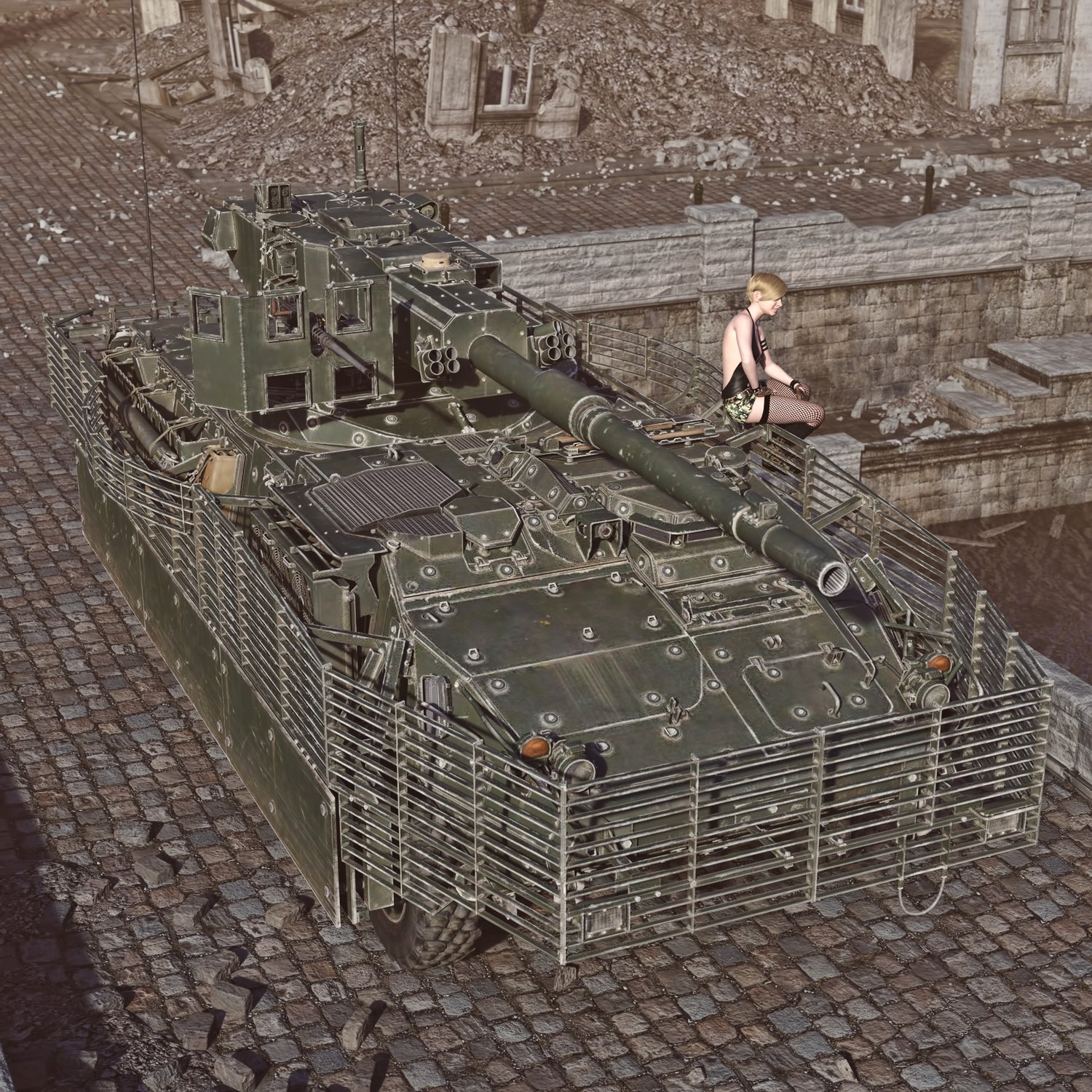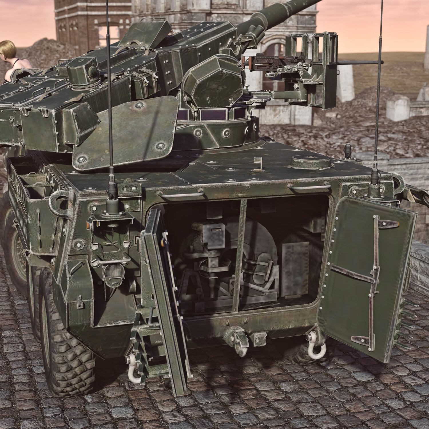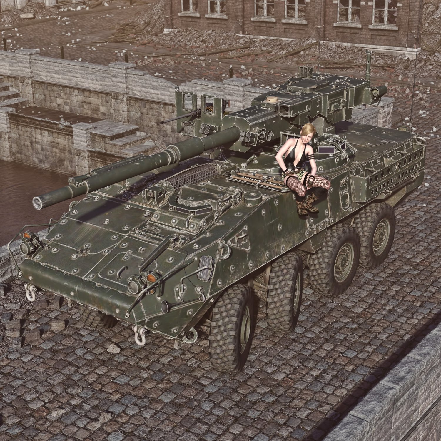 A cool mobile gun system of the Stryker family of combat vehicles. Designed for heavy artillery support on a mobile platform. Hatches also can be open for dismount and easy access. The turret is mainly a gun, and is rigged for realistic pictures. Machinegun is also rigged. Good for transportation and for quick artillery support. You can also take some friends with you- it has some space. Has internals and rear space for troops, but it's very limited. Turret and gun also rigged for good positioning. The prop is converted and rigged for DAZ.
