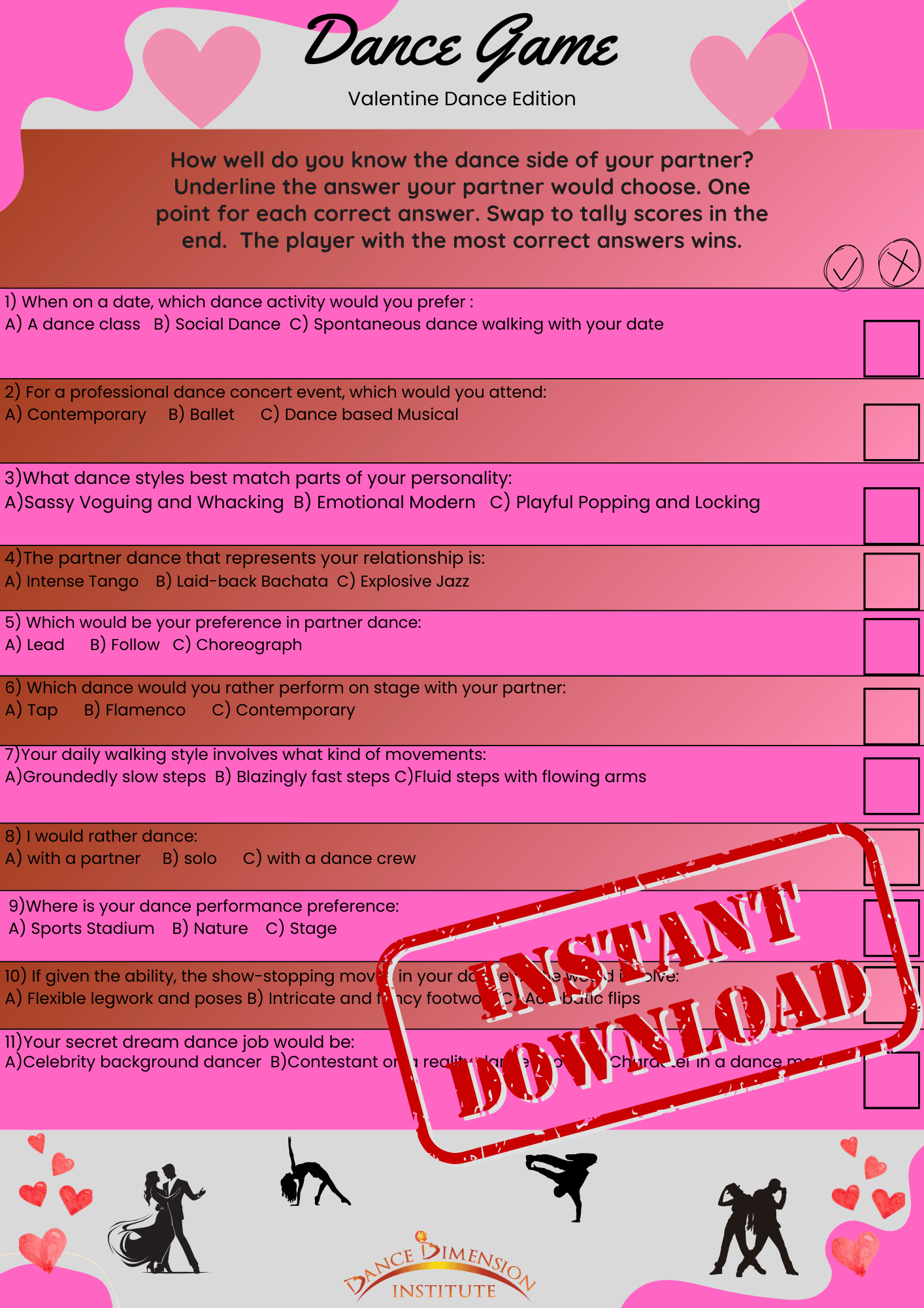 A dance game for you and a partner with a Valentine twist! Test how well you know your partner's 'inner dancer' and how well your partner knows yours! A pair of partners may include friends, family, couples, etc. Pairs can play against other pairs. Great for game night, parties, and other gatherings.