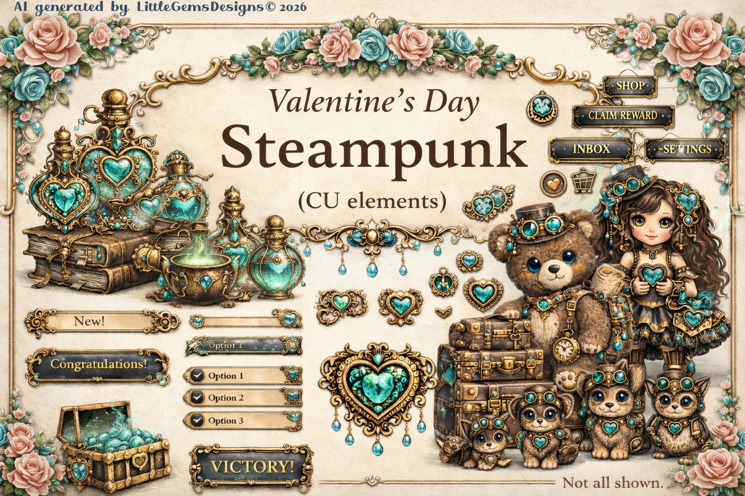 A romantic steampunk collection with Victorian elegance—brass details, gears, filigree, and glowing teal gemstone hearts in a dreamy Valentine palette.