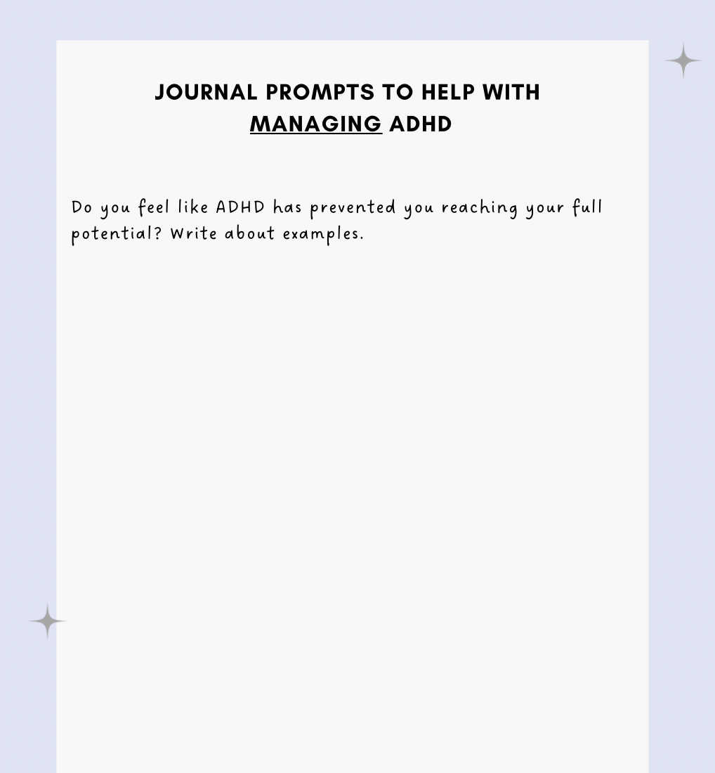 Discover practical strategies and insights with my "Understanding ADHD" workbook and guide, designed to help you navigate life with ADHD. This comprehensive resource includes journal prompts, affirmations, and essential information about ADHD to empower you with the tools you need to thrive.