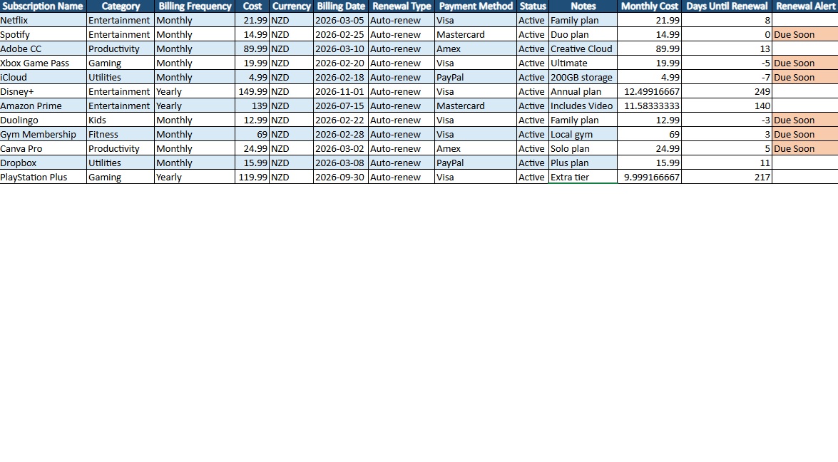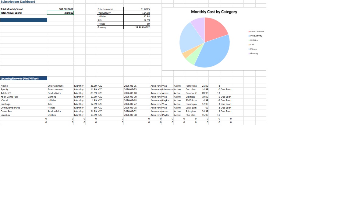Subscription Tracker Spreadsheet