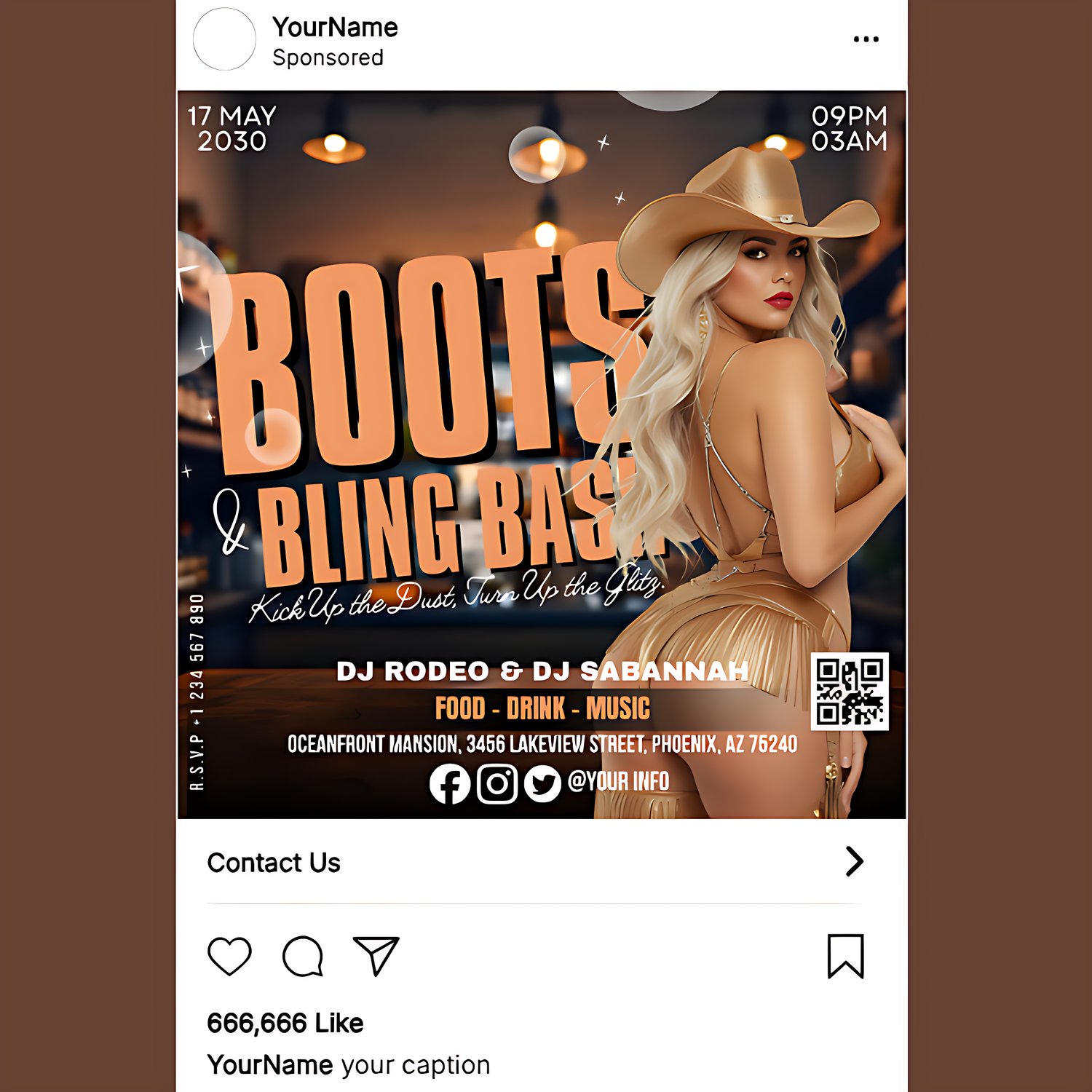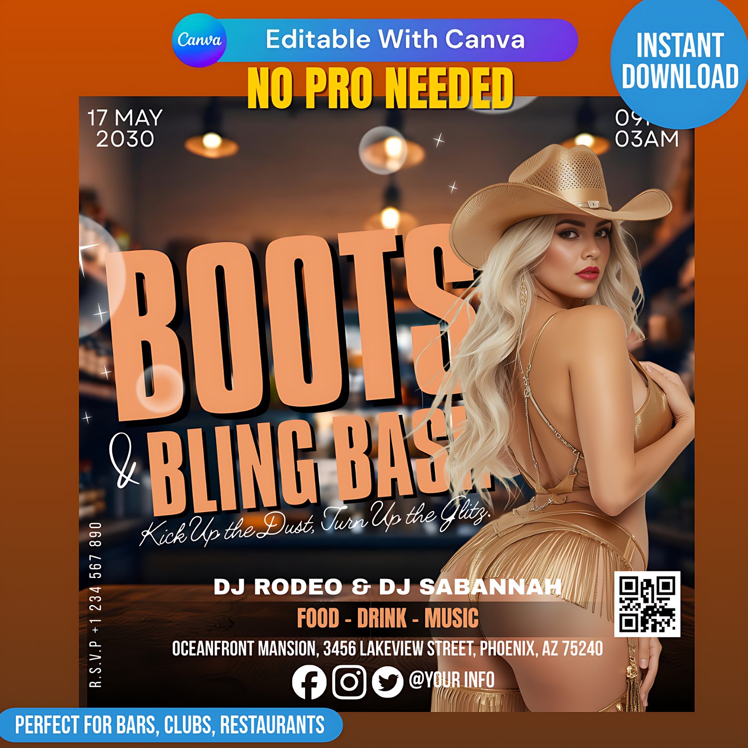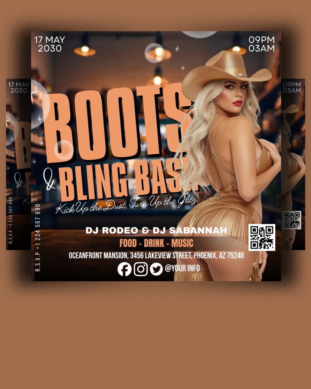 This template captures the perfect blend of rustic cowboy vibes and sparkling glam — ideal for nightclub promos, birthday parties, themed events, girls’ night parties, or any Western-inspired celebration.