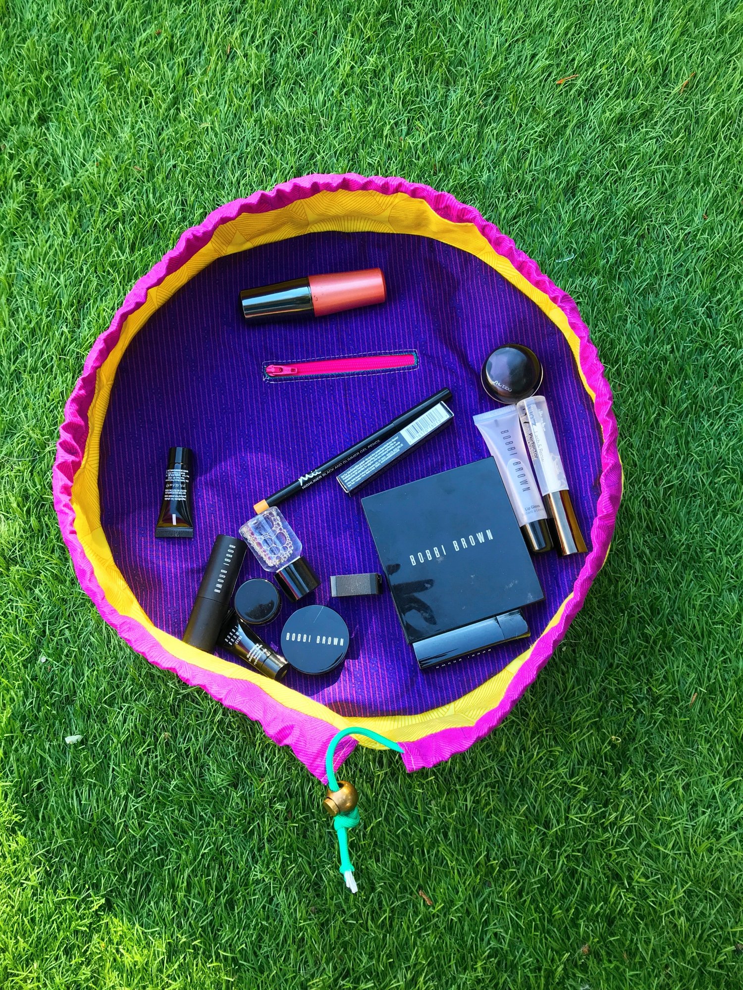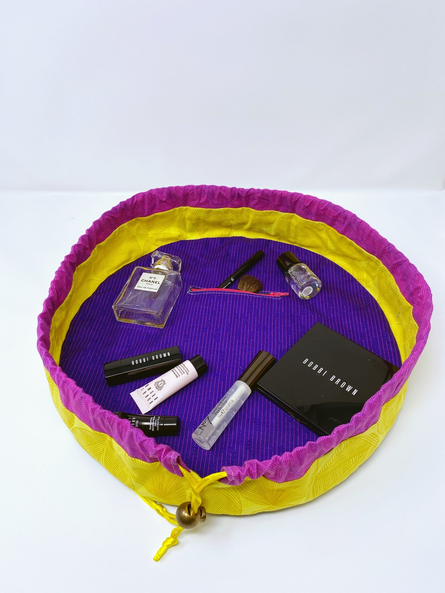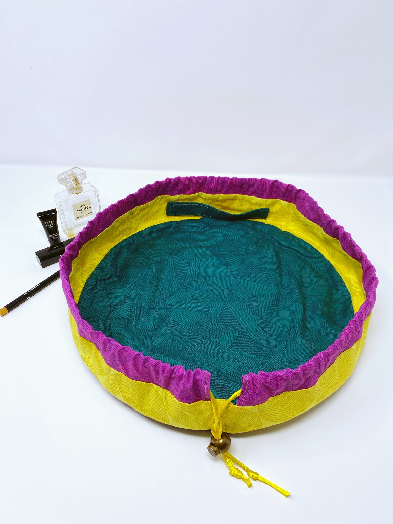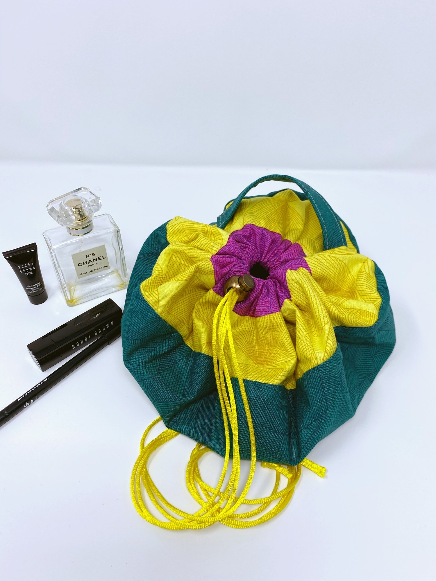 Keep your beauty routine stylish and organized with this vibrant, handmade reversible drawstring makeup bag! Featuring bold, colourful fabrics, this bag can be easily reversed for a fresh look.