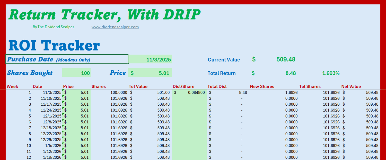Buy your shares, then track your returns. Easily input what you paid, how many shares you bought, and how much the weekly dividend is. Automatically calculates your TOTAL return- even if the share price drops. No more guessing. No more "hoping" you've made money on a ETF. Know FOR SURE!!