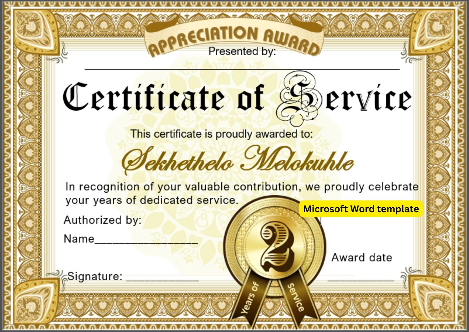 Mark a significant milestone in your employees' journey with our exclusive "02 Years of Service" digital certificate template for MS Word.