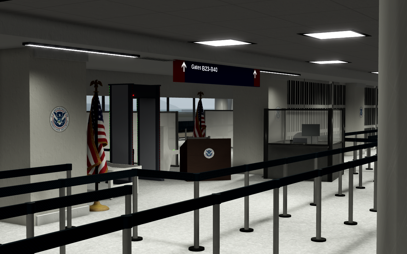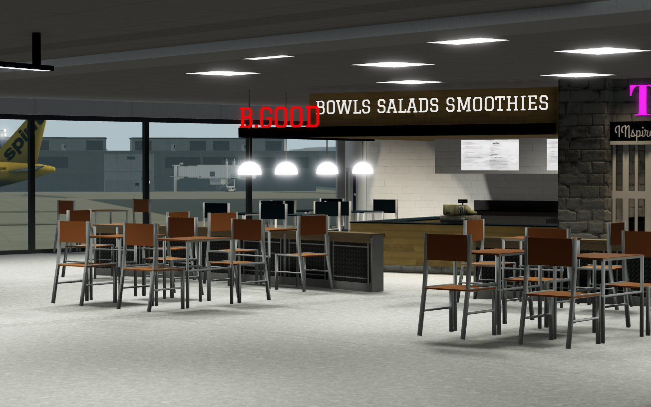 -High-quality interior including: check-in area, gate areas, bathrooms, security, airport stores.