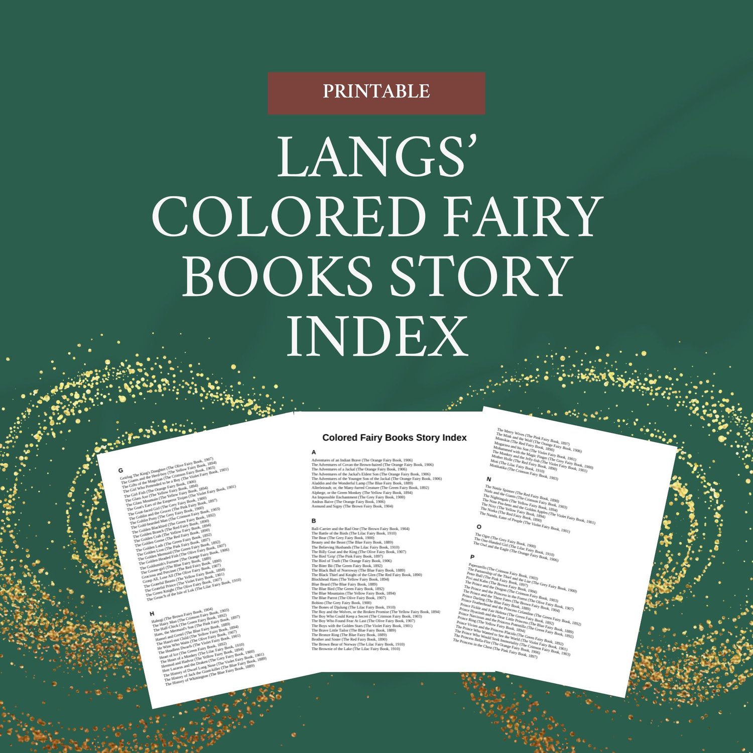 A printable, alphabetical index of all the stories included in the 12 colored Fairy Books produced by Leonora Blanche Lang and Andrew Lang. PDF format!