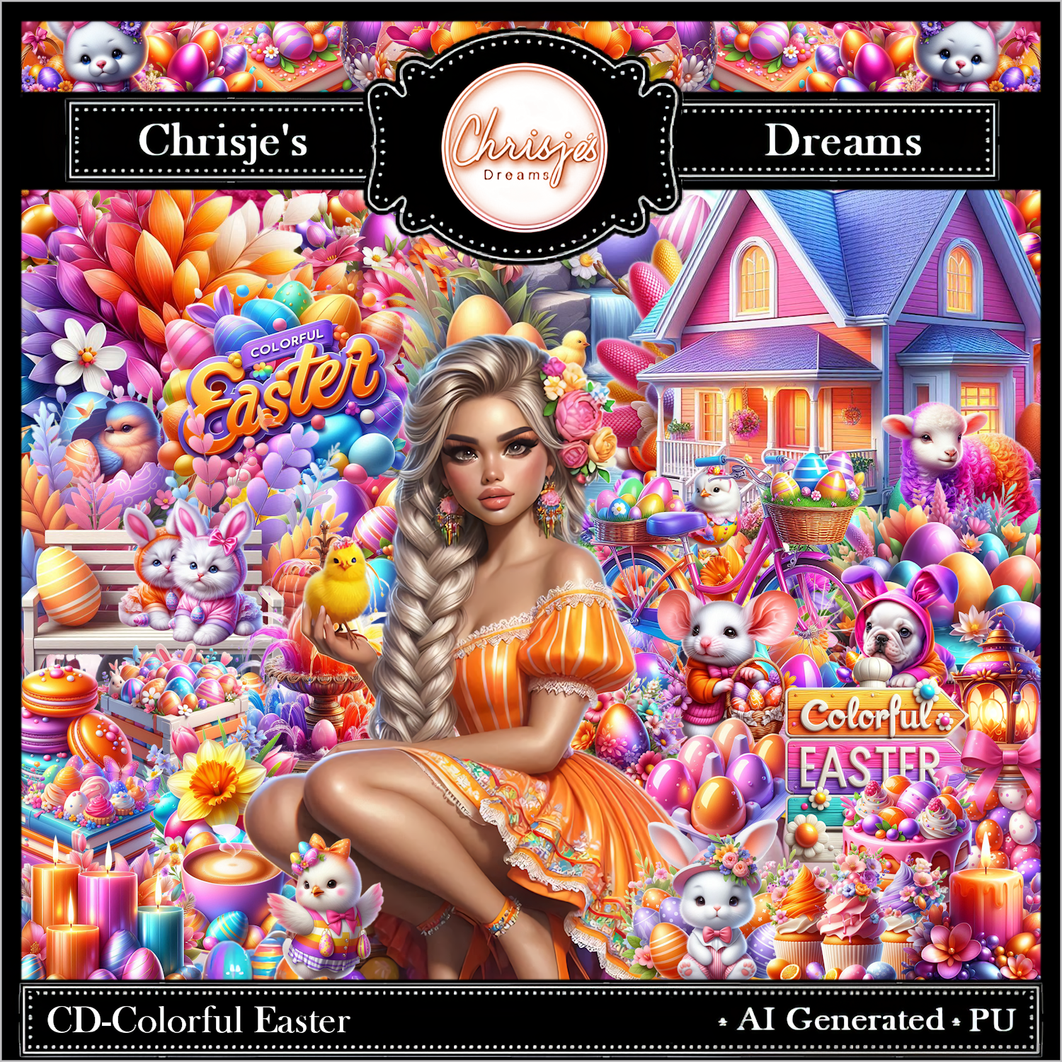 Colorful Easter is a 🐰Easter 🐰themed kit which contains 163 elements, 6 Frames, 24 papers and 2 beautiful AI generated png tubes by Chrisje's Dreams.