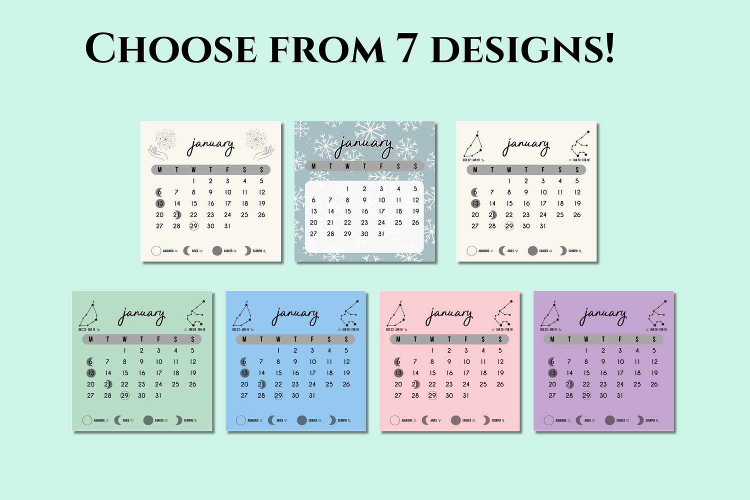This calendar comes in two sizes: 3x3 and 4x4 inches, each in A4 and Letter formats ready to print. It also includes two versions: Monday or Sunday start.