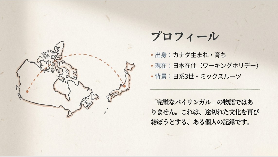 実例12:カナダ出身で現在はワーキングホリデーを利用して日本に滞在している、日本人のルーツを持つ人物のリアル体験談|親御さんに読んでいただきたい|ストーリーボード|(全13ページ)PDF download|約500円(ほぼワンコイン)