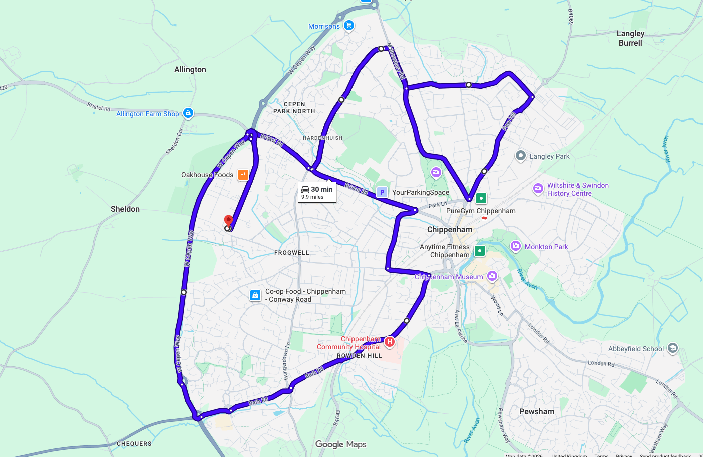 Practise real driving test routes in Chippenham before your exam – open directly in Google Maps