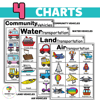 -48 transportation and vehicles related words in 4 charts. (12 land transportation, 12 air transportation, 12 water transportation and 12 community vehicles)