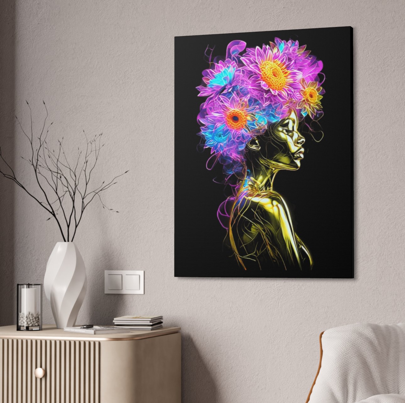 Each "Aura of Gold" print is a testament to meticulous artistry and uncompromising quality. Crafted with the utmost precision, the luminous metallic effects and the dynamic spectrum of neon florals are rendered with a depth and clarity that defy expectation. Printed on a luxurious 1.5-inch stretched canvas, this piece commands attention, offering a substantial and refined presence that speaks volumes about its quality. This is an acquisition for those who appreciate the finer details, a distinctive statement piece that promises to be a source of constant inspiration and admiration, reflecting your refined taste and love for the extraordinary.