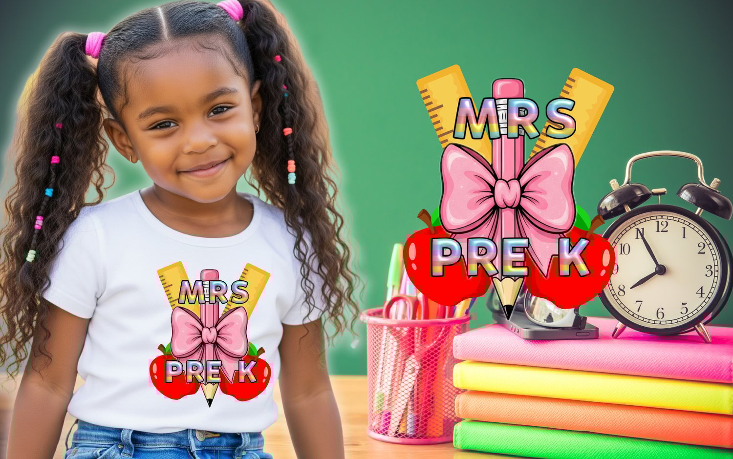 ✔️ Fun & colorful school elements (ruler, pencil, bow, apples)