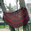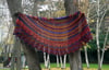 Black Hole Sun is an half-pi shawl knitted with several eyelet and lace patterns. The shawl is knitted from top down with simple yarn over increases and has two different lace border patterns. The size is easy to adapt by legthening or shortening the last lace pattern. I used a cheap self-striping yarn, but the shawl works great also in solid colored yarns.