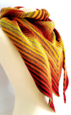 The red/brown shawl is knit in Miss Babs Gradient in Yummy 2-ply Toes in Sugar Maple (red) and Espresso (brown). The purple/gold shawl is knit in Dutch Iris One (purple) and Old Gold (gold).